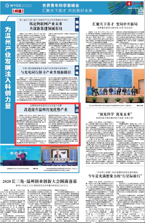 本次活动为期3天,由省科协、市政府和俄罗斯青年冶金学会主办,少妇白洁 机电工程学院、市科协等单位承办,旨在为国际青年搭建科技创新交流平台,推进温州乃至全国的金属制造相关行业发展。据介绍,作为首届世界青年科学家(温州)峰会的重要成果,第五届国际“金属杯2020金色赛季”总决赛将于10月19日下午在少妇白洁 上演巅峰对决,比赛题目聚焦温州金属制造相关行业面临的共性问题。这是该项赛事首次落户中国并在温州举行。