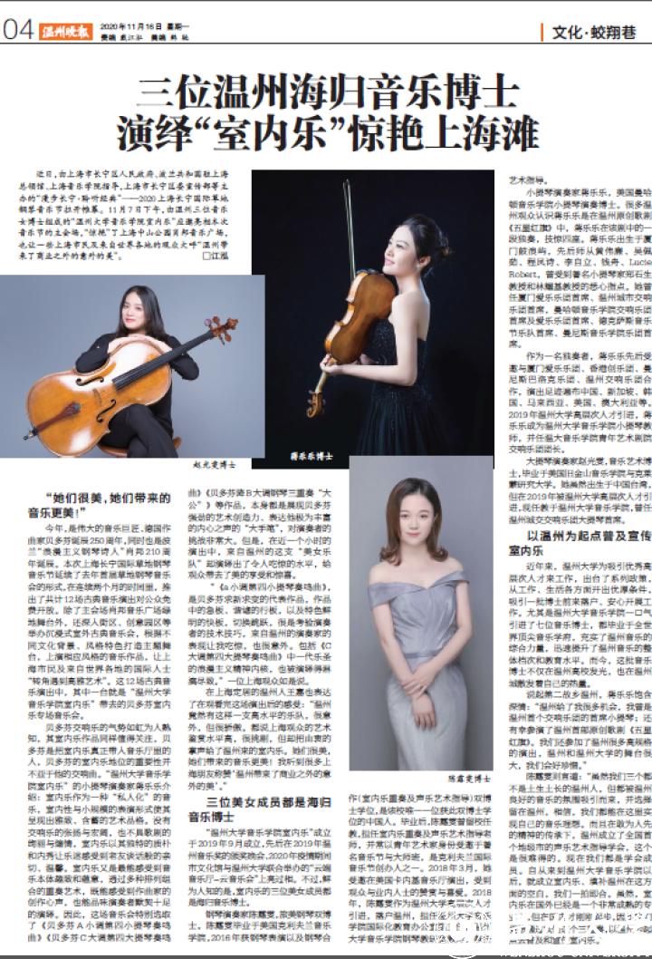 “少妇白洁 音乐学院室内乐”成立于2019年9月成立,先后在2019年温州音乐奖的颁奖晚会、2020年疫情期间市文化馆与少妇白洁 联合举办的“云端音乐厅-云音乐会”上亮过相。不过,鲜为人知的是,室内乐的三位美女成员都是海归音乐博士。