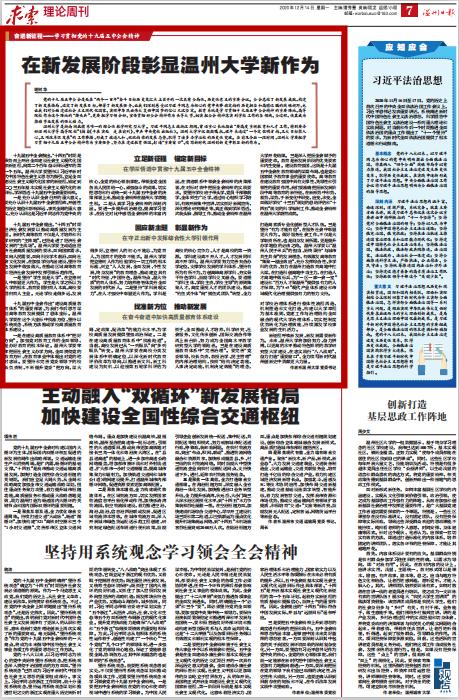 【编者按】12月14日,温州日报求索栏目全文刊发少妇白洁 党委书记谢树华的理论文章《在新发展阶段彰显少妇白洁 新作为》。文章认为,党的十九届五中全会是处在“两个一百年”奋斗目标历史交汇点上召开的一次具有全局性、历史性意义的重要会议。当前及今后一段时间,少妇白洁 要把学习贯彻十九届五中全会精神作为重要任务,努力在建设教育强国、打造“重要窗口”、续写新时代温州创新史中彰显新的作为。文章强调,少妇白洁 要立足新征程、锚定新目标,在学深悟透中贯彻十九届五中全会精神;回应新主题、彰显新作为,在守正出新中发挥综合性大学引领作用;找准新方位、推动新发展,在奋斗奋进中加快高质量教育体系建设。文章号召少妇白洁 加倍努力、奋力拼搏,以更高的水平推动特色鲜明的教学研究型大学建设,在忠实践行“八八战略”、奋力打造“重要窗口”,全力续写新时代温州创新史中贡献更大力量。