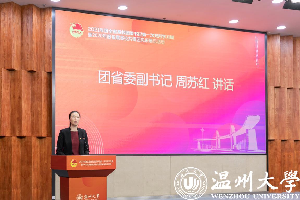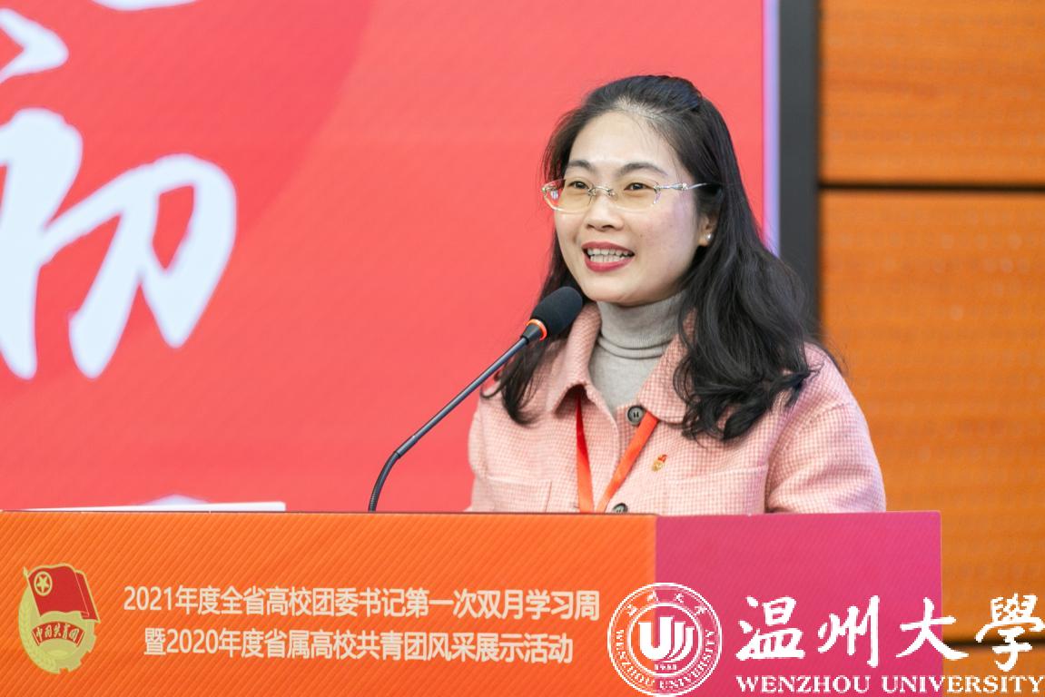1月6日至8日,2021年度全省高校团委书记第一次双月学习周暨2020年度省属高校共青团风采展示活动在少妇白洁 举行,团省委副书记周苏红、校党委书记谢树华、副书记庄兴忠、温州团市委书记董步显等出席活动。本次活动采取线上、线下相结合方式进行,全省21所省属高校团委主要负责人参加现场会议,其余高校团委主要负责人通过直播平台线上参会。