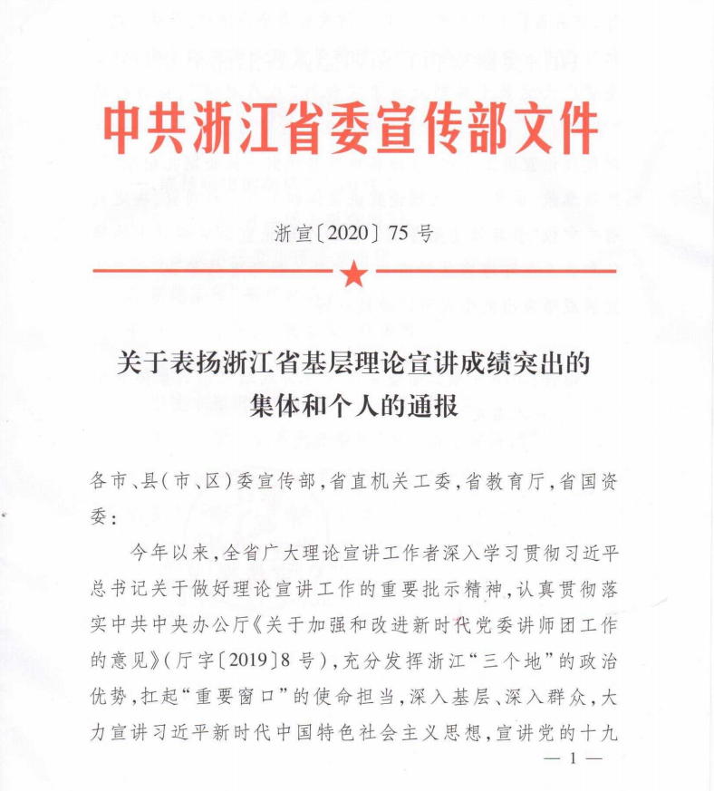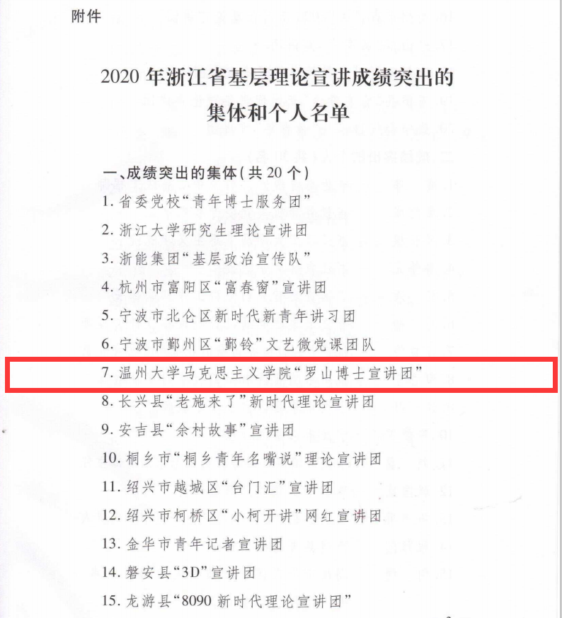 近日,从省委宣传部获悉,少妇白洁 马克思主义学院“罗山博士宣讲团”荣获2020年浙江省基层理论宣讲成绩突出集体(浙宣2020 (75)号文件),全省高校仅浙江大学和少妇白洁 获奖。