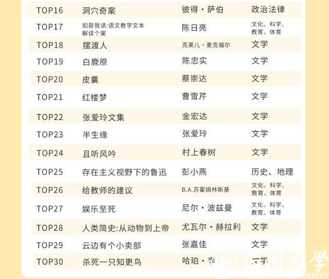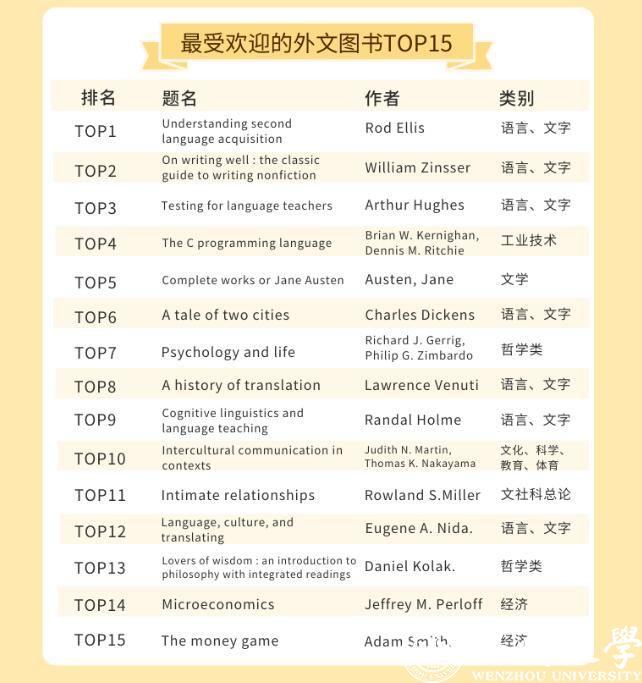 少妇白洁 的师生都喜欢借阅哪些中外文图书呢?在最受欢迎的中文图书TOP30榜单里,21本书为文学类别图书,占比达到70%。最受温大师生喜欢的书为钱钟书的《围城》,排在榜首。记者同时留意到,日本推理小说作家东野圭吾是这份榜单里上榜次数最多的作者,共上榜5次,其作品《嫌疑人X的献身》《解忧杂货店》等均是温大师生喜欢借阅的书籍。