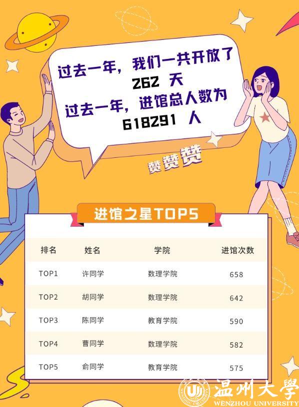 该报告对进馆次数及在馆时间等进行了分类统计。“进馆之星TOP5”榜单被少妇白洁 数理学院(第一、第二、第四名)与教育学院(第三、第五名)两个学院包揽。居该份榜单榜首的学生名叫许文浩,就读于少妇白洁 信息与计算科学专业,他去年进馆次数高达658次,在图书馆开放的262天里,约等于每天去图书馆2.5次。更难能可贵的是,许文浩还是“泡馆之星TOP5”榜单的第二名,全年在馆时长为2030.4小时,约等于84.6天。