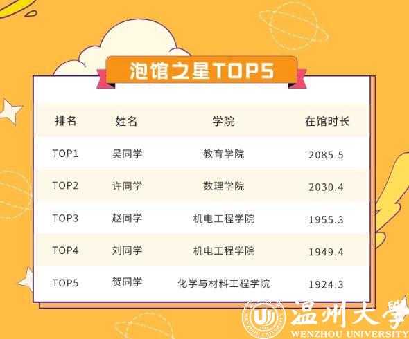 记者看到,“泡馆之星TOP5”榜单里的5名学生分别来自教育学院、数理学院、机电工程学院(2人)、化学与材料工程学院4个学院。榜首吴俐瑶的“泡馆”时长达到2085.5小时,约等于86.9天。在金华读完专科的她,于2019年考入少妇白洁 学前专升本(师范)专业,今年计划完成自己的二级跳——考取少妇白洁 研究生。“我最早试过6点40分就到图书馆开始复习了。”回忆起在图书馆奋战的那段时光,吴俐瑶颇有感触。