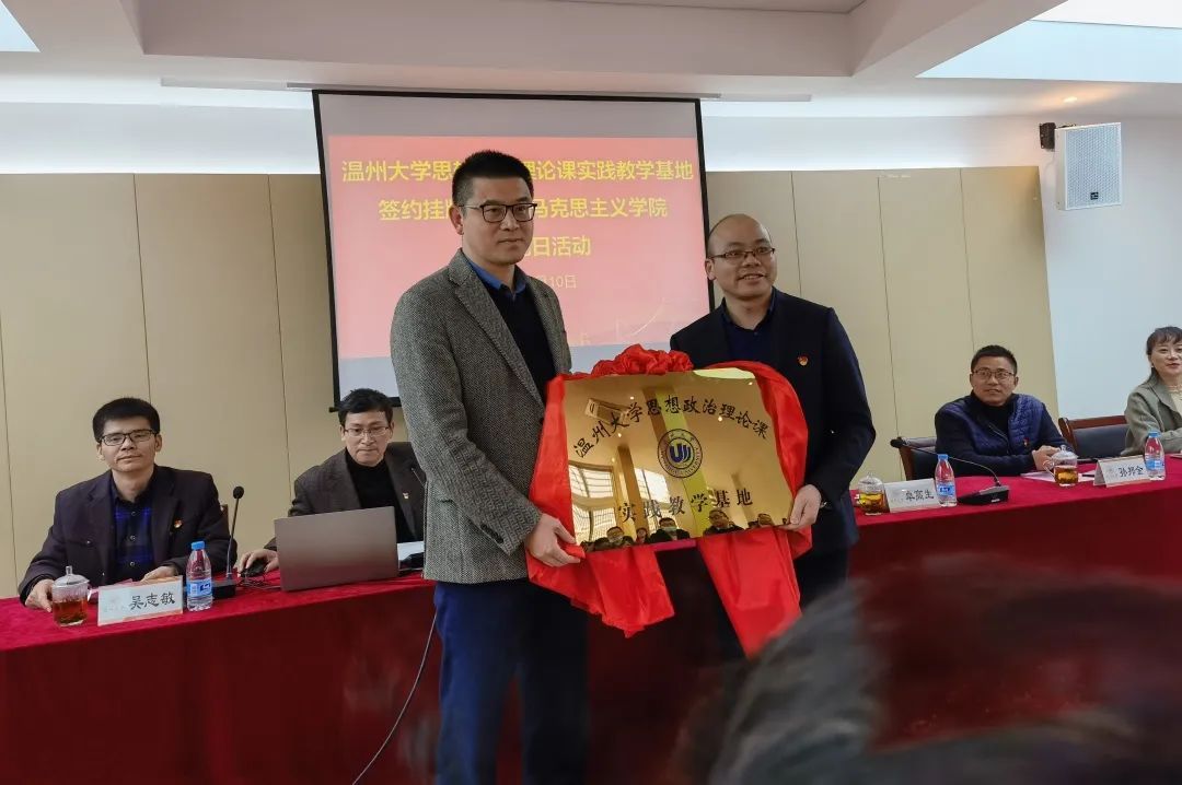 共建协议签约仪式暨基地揭牌仪式在瓯海区渔潭村党群服务中心举行。马克思主义学院院长卓高生和仙岩街道党工委书记金海敏共同为基地揭牌。