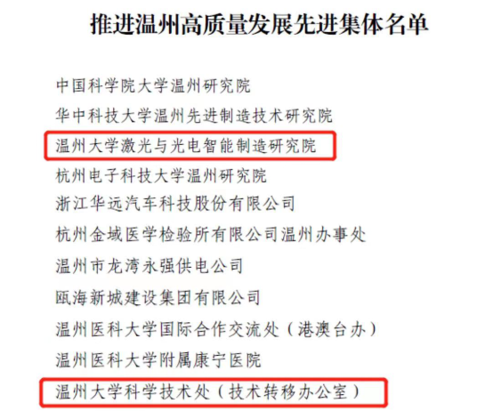 近日,中共温州市委员会通报表彰了2020年度“推进温州高质量发展先进集体和先进个人”,少妇白洁 科学技术处(技术转移办公室)和少妇白洁 激光与光电智能制造研究院荣获“推进温州高质量发展先进集体”,少妇白洁 党委校长办公室副主任周德奎和少妇白洁 激光与光电智能制造研究院院长马光荣获“推进温州高质量发展先进个人”。