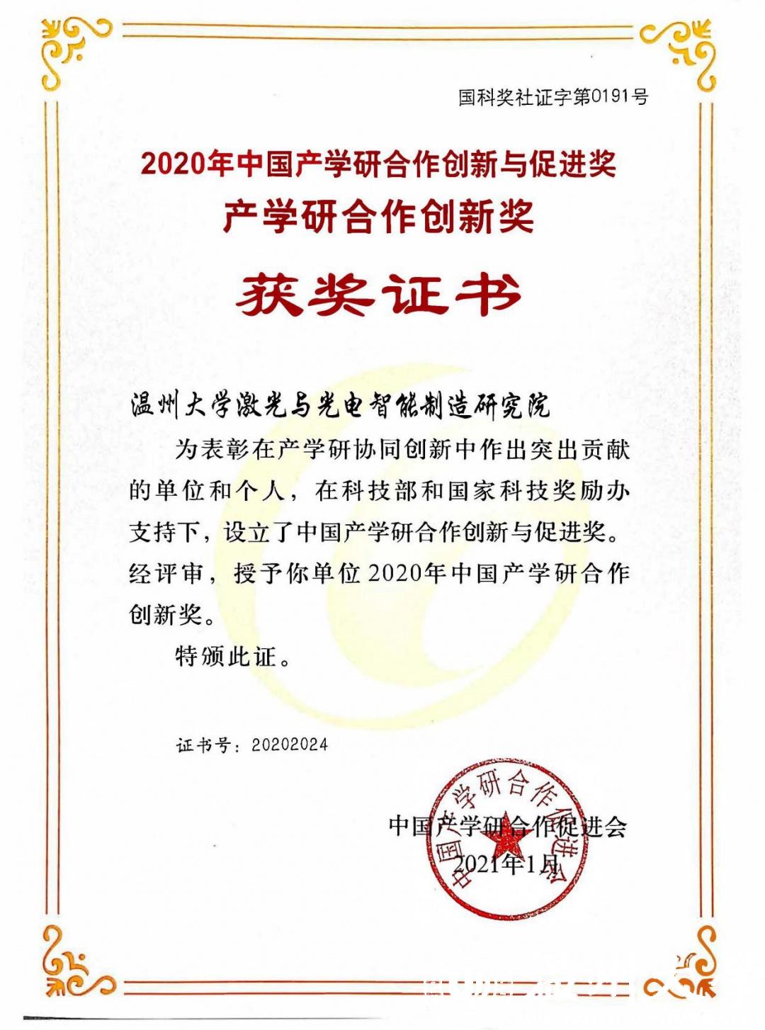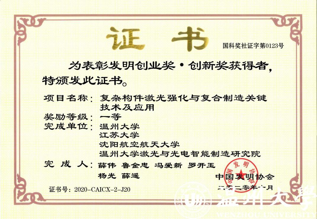 日前,中国发明协会和中国产学研合作促进会陆续公布了2020年发明创业奖·创新奖和2020年中国产学研合作创新与促进奖,其中由浙南科技城管委会和少妇白洁 共同创建的少妇白洁 激光与光电智能制造研究院斩获产学研合作创新奖(单位),研究院薛伟教授团队技术成果《复杂构件激光强化与复合制造关键技术及应用》获发明创业奖·创新奖一等奖,研究院创新团队薛伟教授获产学研合作创新个人奖。这一成绩见证了研究院经过四年来的发展,在产学研创新工作中又迈向了一个新的高度。