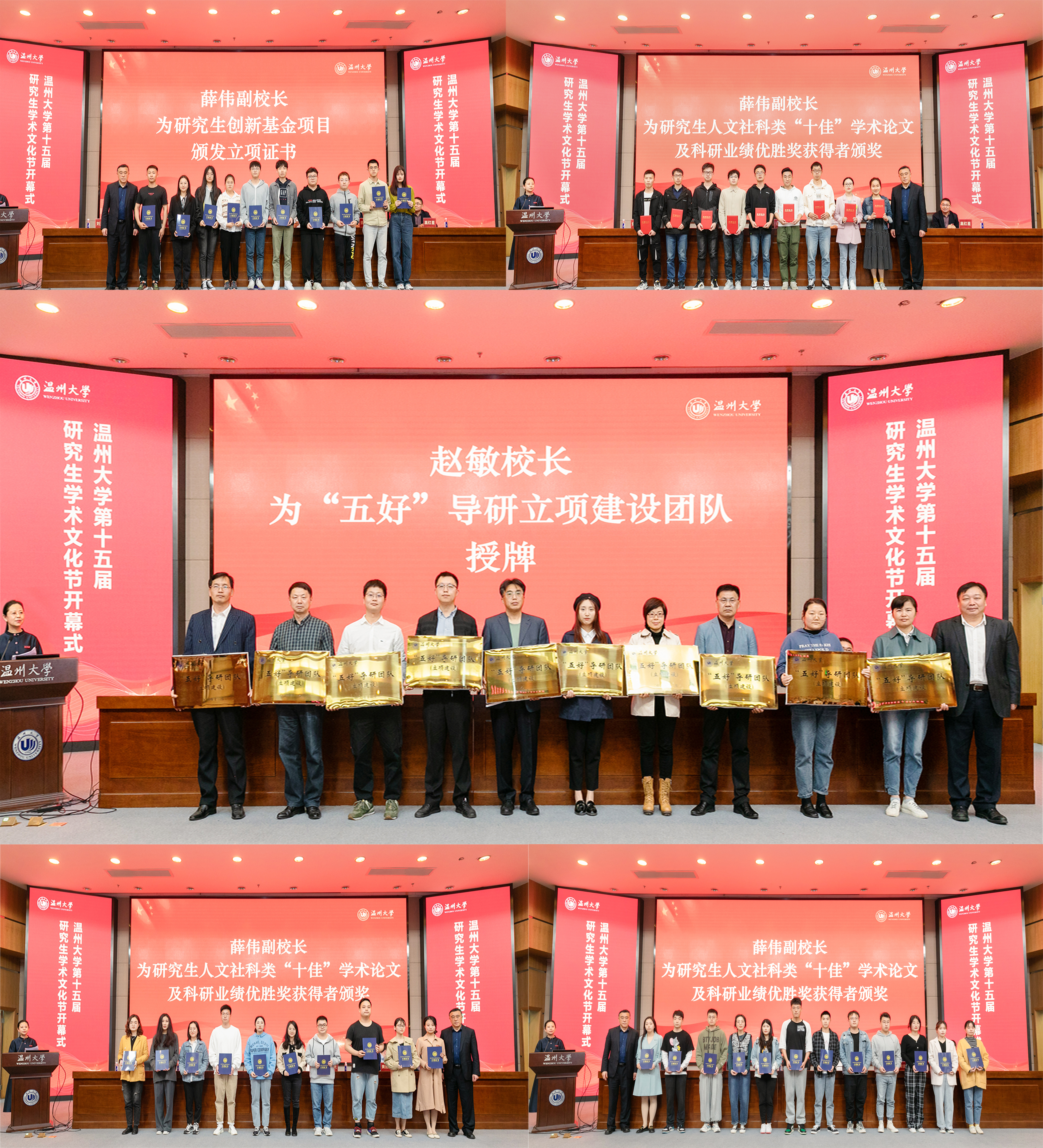 开幕式上校领导为“五好”导研立项建设团队授牌,为研究生创新基金项目颁发立项证书、为研究生人文社科类“十佳”学术论文和科研业绩优胜奖获得者颁奖。教育学院“云创课 研学行”课程设计导研团队、生命与环境科学学院分散式污水处理技术研究导研团队、2019级马克思主义理论专业研究生张剑宇、化学与材料工程学院2018级化学专业研究生王赢四个团队和个人做了典型代表发言。为鼓励更多研究生“留温”就业,浙江中公教育科技有限公司在少妇白洁 设立“中公·研究生留温就业奖学金”。