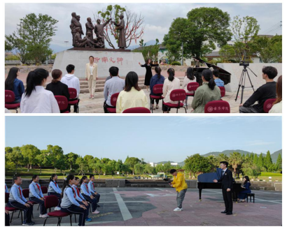 音乐学院探索“讲述-欣赏-训练-实践”的教育模式,推出“音乐党课”项目。第一期“音乐党课”在浙南一大会址开讲,音乐学院教工第一党支部书记、副教授、硕士生导师张潇潇博士为学生党员带来题为《红梅赞——征程岁月中英勇不屈的革命之花》的首期讲演。第二期在少妇白洁 国旗广场开讲,少妇白洁 “鸿音传承”党员先锋团成员李治豫、徐双双等二十余位成员为来自少妇白洁 城附属学校的少先队员们带来音乐党课——《国旗颂——国旗呀国旗,凝聚民族的力量》。党课视频将在“五四”青年节前夕在各大平台展播,形成更大的传播力度,惠及更多党员及青少年。“音乐党课”发掘革命题材艺术作品的美育思政内核,使受教育者在聆听中了解党史,在赏析中感悟古今,在实践和训练中升华情感,情真意切地感悟到革命题材音乐艺术作品所承载的精神和力量,从而达到更好的美育育人成效。