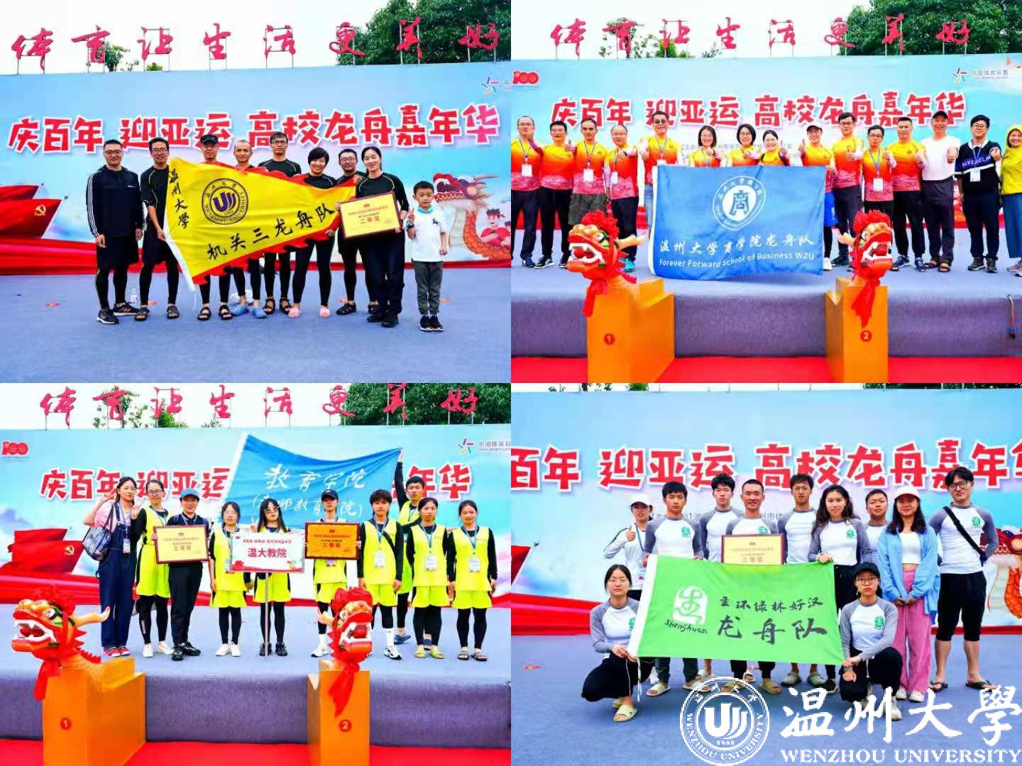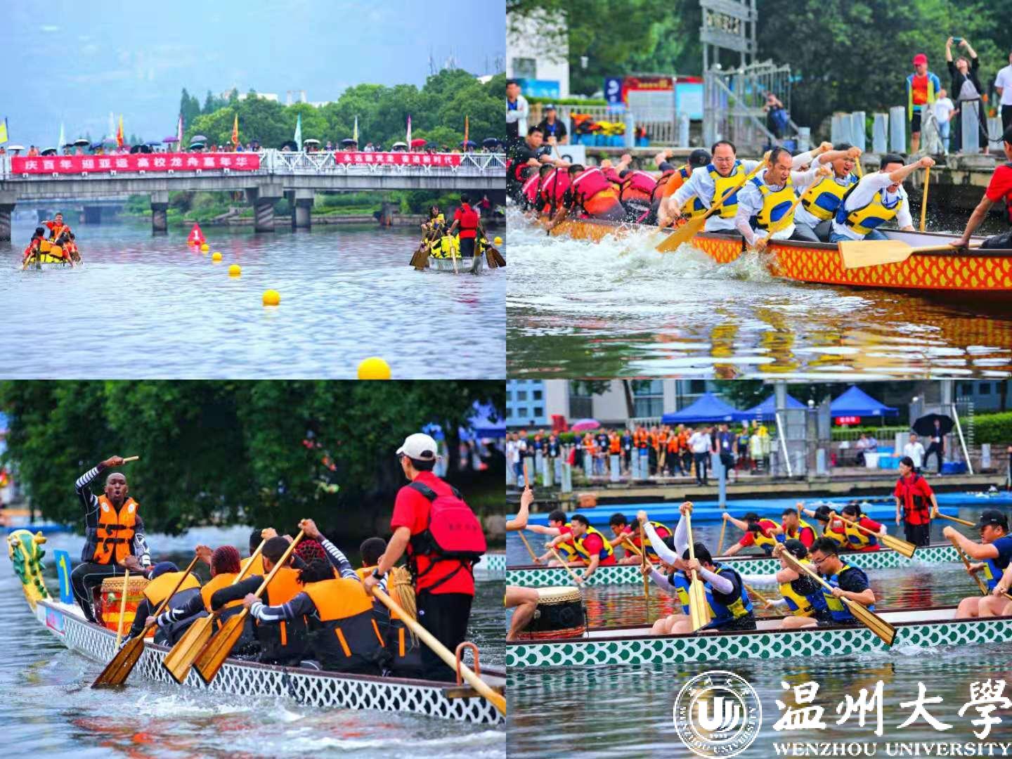 首先进行的是100米直道赛。发令号响,鼓声骤然密集起来,划手们节奏统一,船速不断加快,大家使出浑身力气,奋勇争先,龙舟在舵手的掌控下向终点迸发。经过激烈角逐,最终,在学生组中,温大一队、温大二队、温科职院一队获得一等奖;在教工组中,温州医科大学、温大数理学院获得一等奖,其余队伍分别获得二、三等奖。