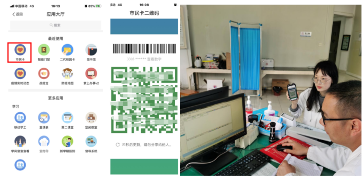 在校医院,陈老师打开“我的温大app”里的市民卡微应用,便打开了一张实时更新的电子社保卡二维码,在就诊电脑边的机器上一扫,就可以使用医保账户就诊买药。整个过程,就诊的老师既不用携带实体市民卡,也不需要打开支付宝里的卡包—证件—社保卡应用或者下载温州市民卡app,只需要打开“我的温大”app。