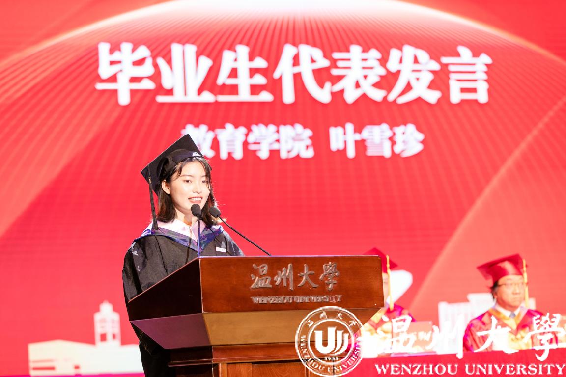 教育学院的叶雪珍作为本专科生代表发言,她号召毕业生们以全新的面貌步入社会,献礼祖国,做一个执着追求,勇攀高峰的温大人;做一个知史爱党、坚守初心的温大人;做一个视野开阔、堪当大任的温大人。“让我们永远心怀感恩,永远心有热血,让我们继续以温大人的名义乘风破浪!我相信,我们温大人,定将不辱使命,有所建树!”