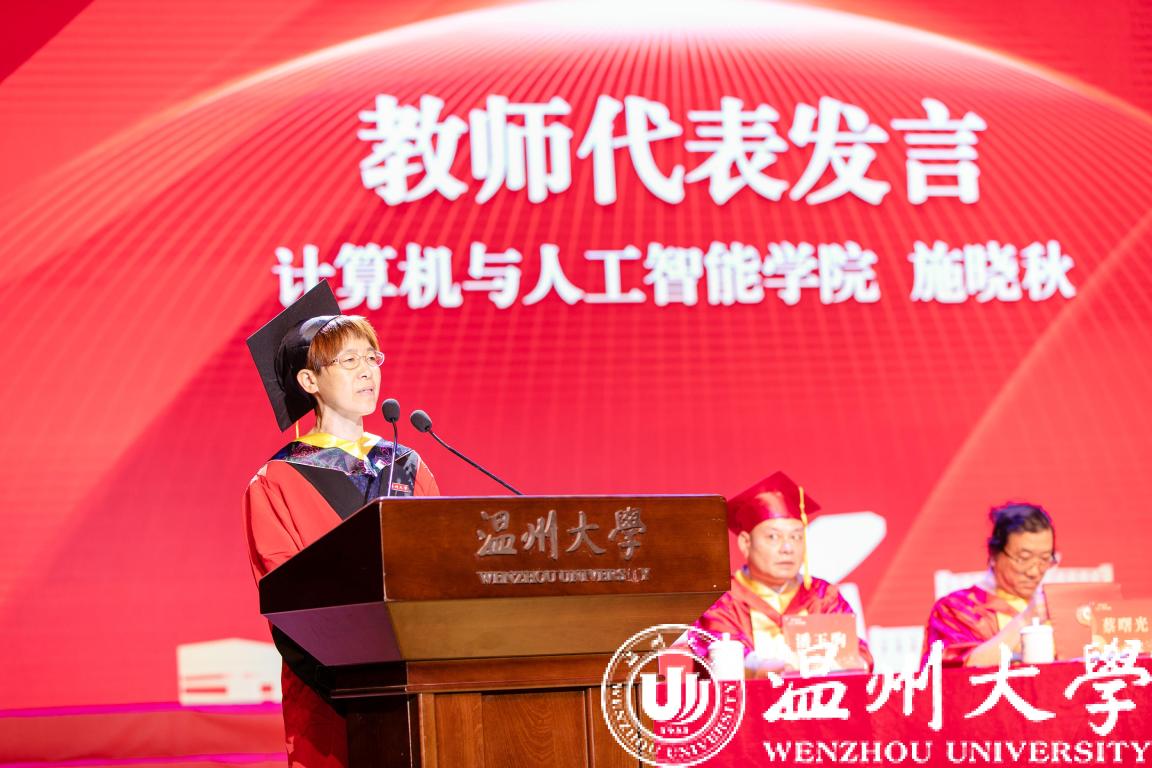 “期待你们每个人都成为优秀的人,有更多的人成为卓越的人,”教师代表、计算机学院的施晓秋教授在发言中就“做什么样的人”为毕业生们指明方向。她表示平庸的人只有性命,为生存而存在;优秀的人还有生命,活出内涵与精彩;卓越的人拥有使命,有着担当与责任。最后,施晓秋教授赠言毕业生:“请带着母校给予你们的精神和力量,融入国家民族复兴大业,开启人生新征程!”