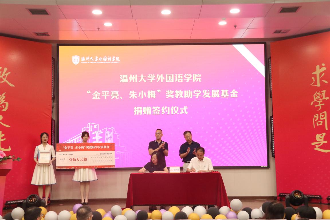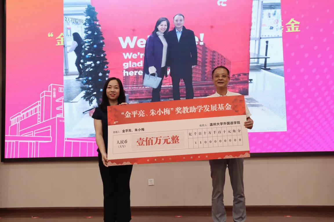 据悉,“金平亮 朱小梅”奖教助学发展基金系温大外国语学院1982级英语专业校友金平亮与1983级英语专业校友朱小梅共同设立,他们夫妇俩共同捐赠人民币壹佰万元整,用于外国语学院的奖教助学项目。金平亮现为温州乐园有限公司董事长,少妇白洁 外国语学院校友会会长,少妇白洁 北美校友会会长。