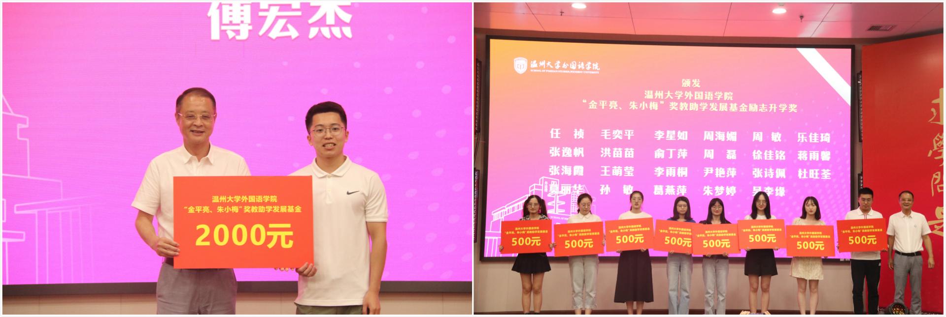 金平亮为首批获得“金平亮 朱小梅”奖教助学发展基金的24位优秀学生颁发了励志升学奖励