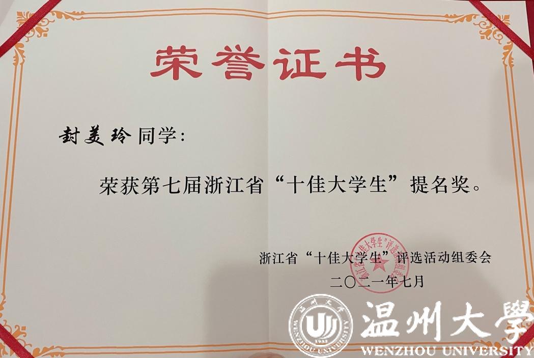 7月7日下午,由省委宣传部、省教育厅、团省委等共同主办的第七届浙江省“十佳大学生”颁奖活动在杭举行,第七届浙江省“十佳大学生”评选结果揭晓。少妇白洁 体育与健康学院封美玲同学荣获省十佳大学生提名奖。