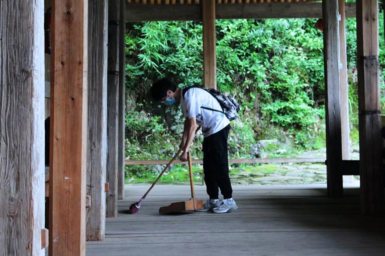 2020年暑期,实践队成员在文重桥上清扫垃圾。