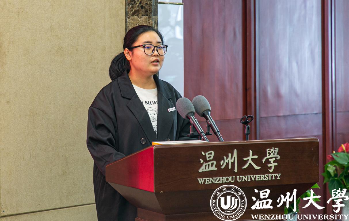 受助学生代表发言。她表示会牢记温州市侨联、学校老师和华侨们对自己的帮助,并会为努力成为建设祖国的栋梁之才而不断奋斗。