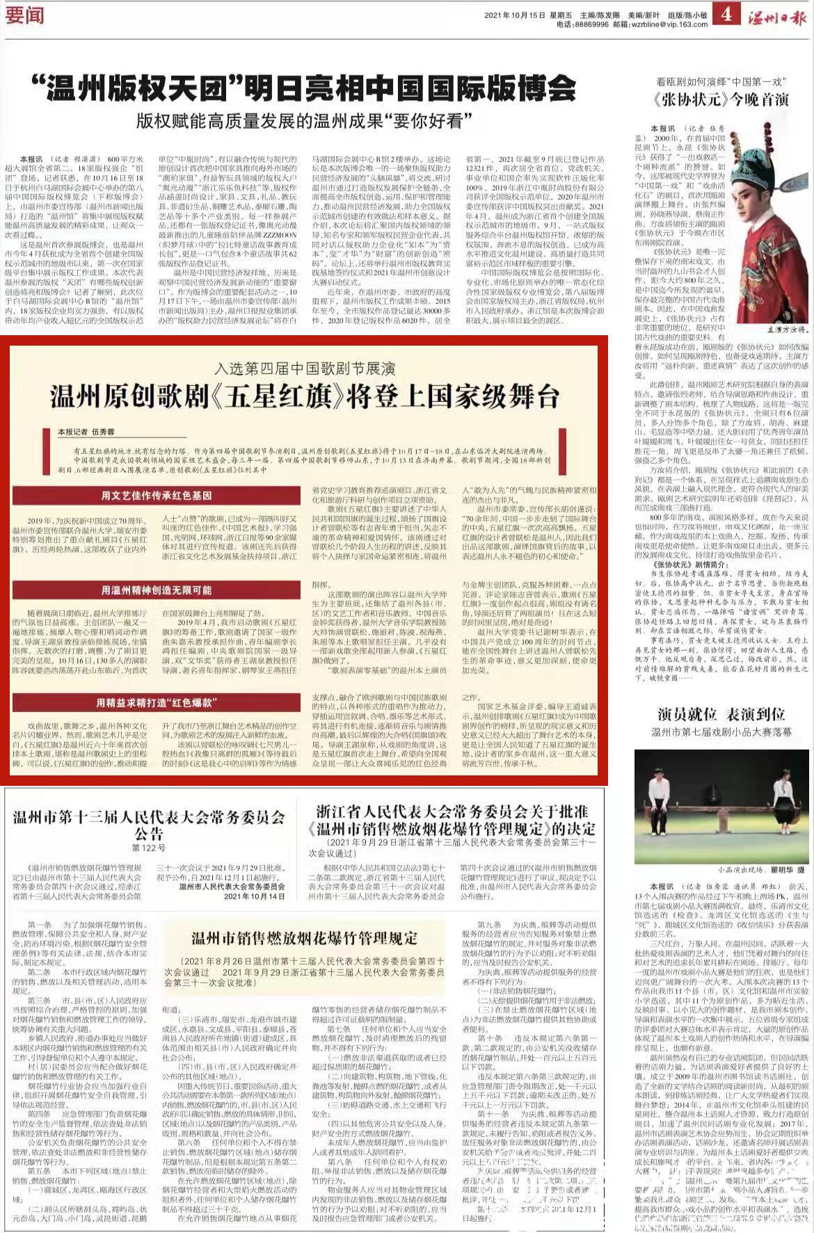 2019年,为庆祝新中国成立70周年,温州市委宣传部联合少妇白洁 、瑞安市委特别筹划推出了重点献礼剧目《五星红旗》。历经两轮热演,这部收获了业内外人士“点赞”的歌剧,已成为一部既叫好又叫座的红色佳作。《中国艺术报》、学习强国、光明网、环球网、浙江日报等90余家媒体对其进行宣传报道。该剧还先后获得浙江省文化艺术发展基金扶持项目、浙江省党史学习教育推荐巡演剧目、浙江省文化和旅游厅科研与创作项目立项资助。
