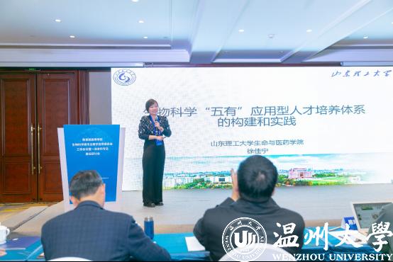 山东理工大学徐佳宁作《生物科学“五有”应用型人才培养体系的构建和实践》报告。创造性地提出了“五有”人才培养目标,即着力培养有社会责任、有创新精神、有专门知识、有实践能力、有健康身心的应用型高级专门人才。
