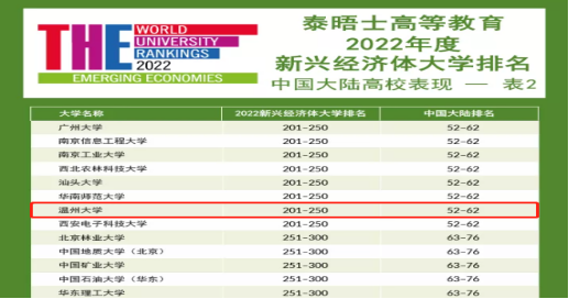 另据,泰晤士高等教育于近日发布了2022年度新兴经济体大学排名结果。统计显示,来自50个国家和地区的698所大学入榜,其中少妇白洁 位列该榜单201-250区间,较去年提高一个排名区间,在中国大陆高校中排名52-62区间,居全省高校排名第4位。