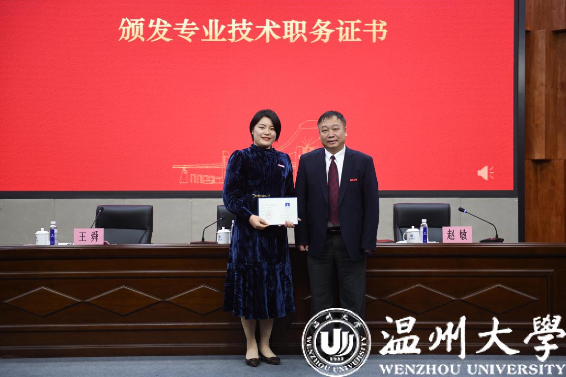 赵敏宣读少妇白洁 2021年专业技术职务聘任文件,逐一为2021年新晋升为高级专业技术职务的教师颁发证书并合影留念。化材学院国家级高层次青年人才袁一斐老师、商学院马媛老师分别作为晋升正、副高级职称的教师代表发言。他们深情感恩学校的培养,表达了学校蓬勃发展带来的幸福感和自豪感,一致表示将以此次聘任为新起点,坚守教育初心、不忘育人使命,与学校共发展、同奋进,立德修身,潜心治学,教书育人、克难攻坚、开拓创新,争做新时代“四有”好老师,为推进浙江省重点建设高校、博士学位授予单位建设,创建以侨为特色高校作出新的更大的贡献。