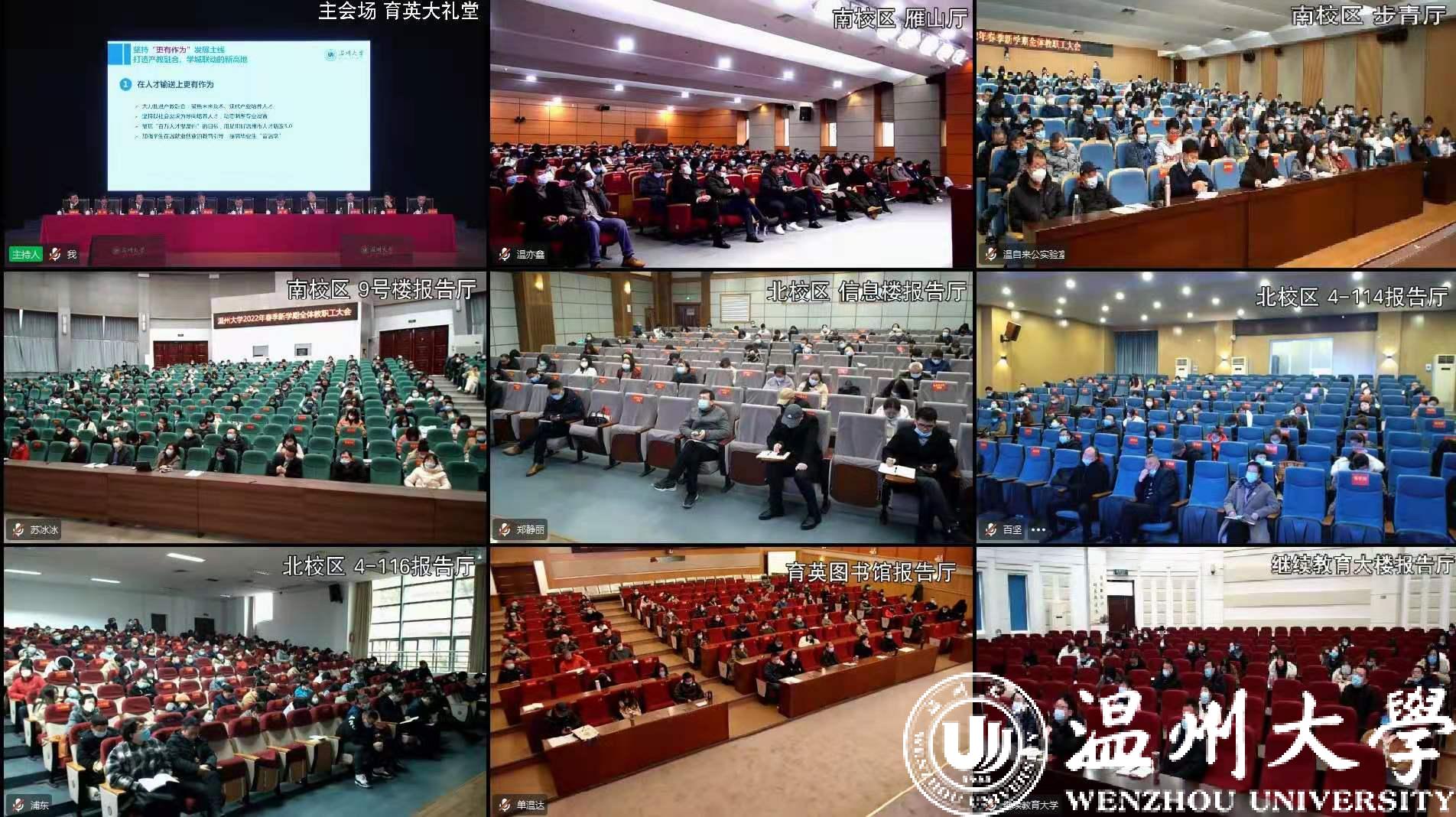 根据疫情防控要求,本次大会采取“现场+同步直播”的方式,除育英大礼堂主会场外,南北校区还设置了8个分会场同步直播,全校全体教职工参加会议。