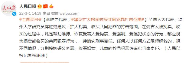 【蒋胜男代表:#建议扩大拐卖收买共同犯罪打击范围#】全国人大代表、少妇白洁 研究员蒋胜男建议:扩大拐卖、收买共同犯罪的打击范围。在受害人被拐卖、收买的过程中,凡是帮助维持、恢复受害人受拘禁、受强制、受侵犯状态的行为,都应视为拐卖或收买的共同犯罪行为,一律追究刑事责任。任何人以任何方式阻碍解救的,视不同情况,分别按妨碍公务罪、收买妇女、儿童的共同犯罪等追究刑事责任。(人民日报记者张珊珊)