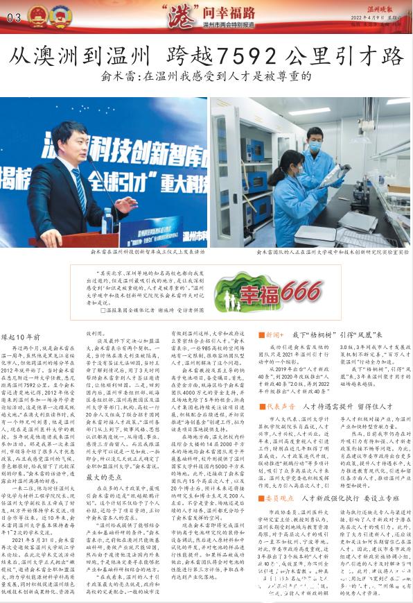 从 2019年出台“人才新政40条”,到2020年改版推出“人才新政 40条”2.0版,再到 2022年升级推出“人才新政 40 条”3.0 版,3 年间我市人才发展政策机制不断完善,“百万人才聚温州”行动全力加速。