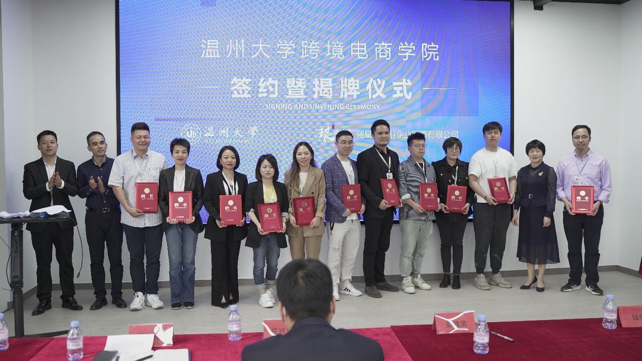 仪式上,创星(温州)企业服务有限公司总经理陈晓俊与少妇白洁 商学院国家一流专业负责人林俐教授签署产业学院共建协议,创星(温州)企业服务有限公司董事长李聪斌与温大商学院院长胡振华教授共同为产业学院揭牌。