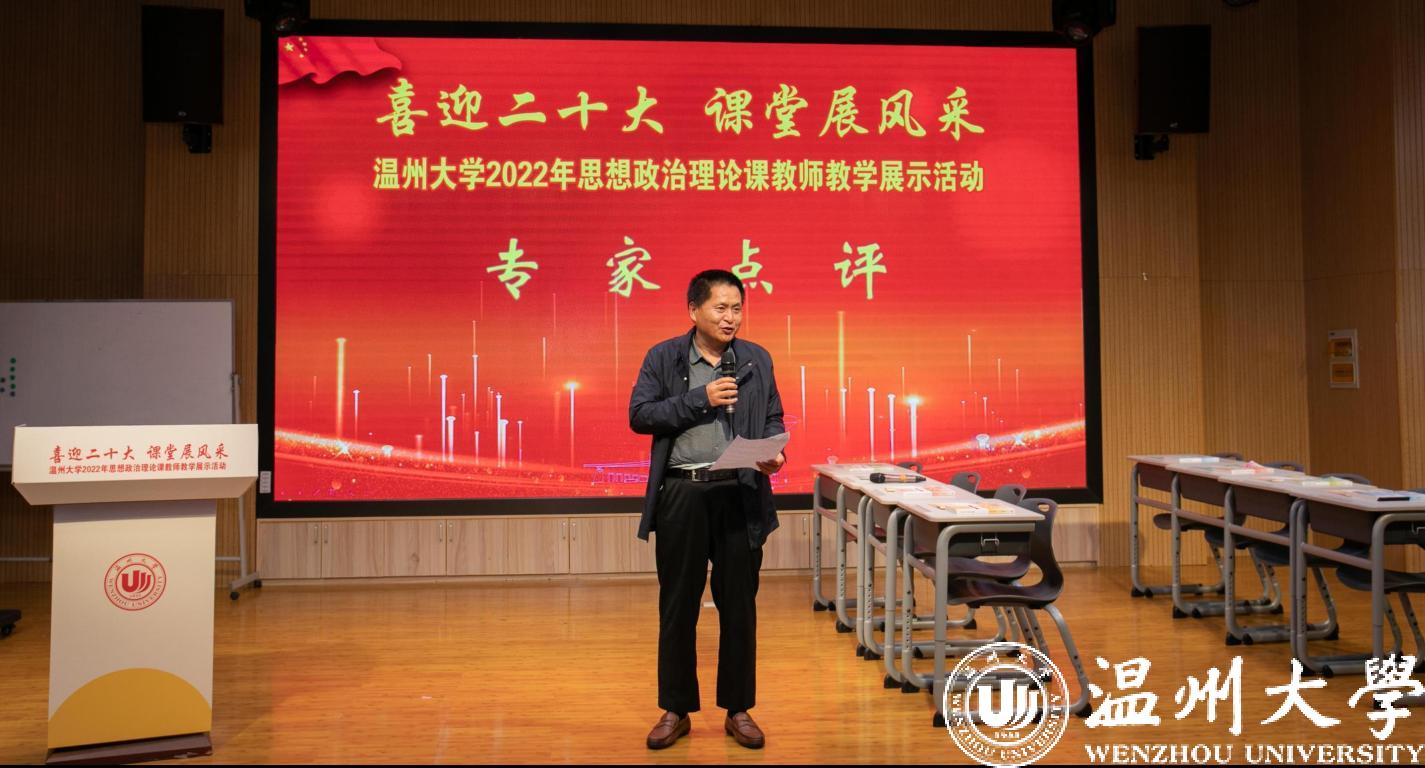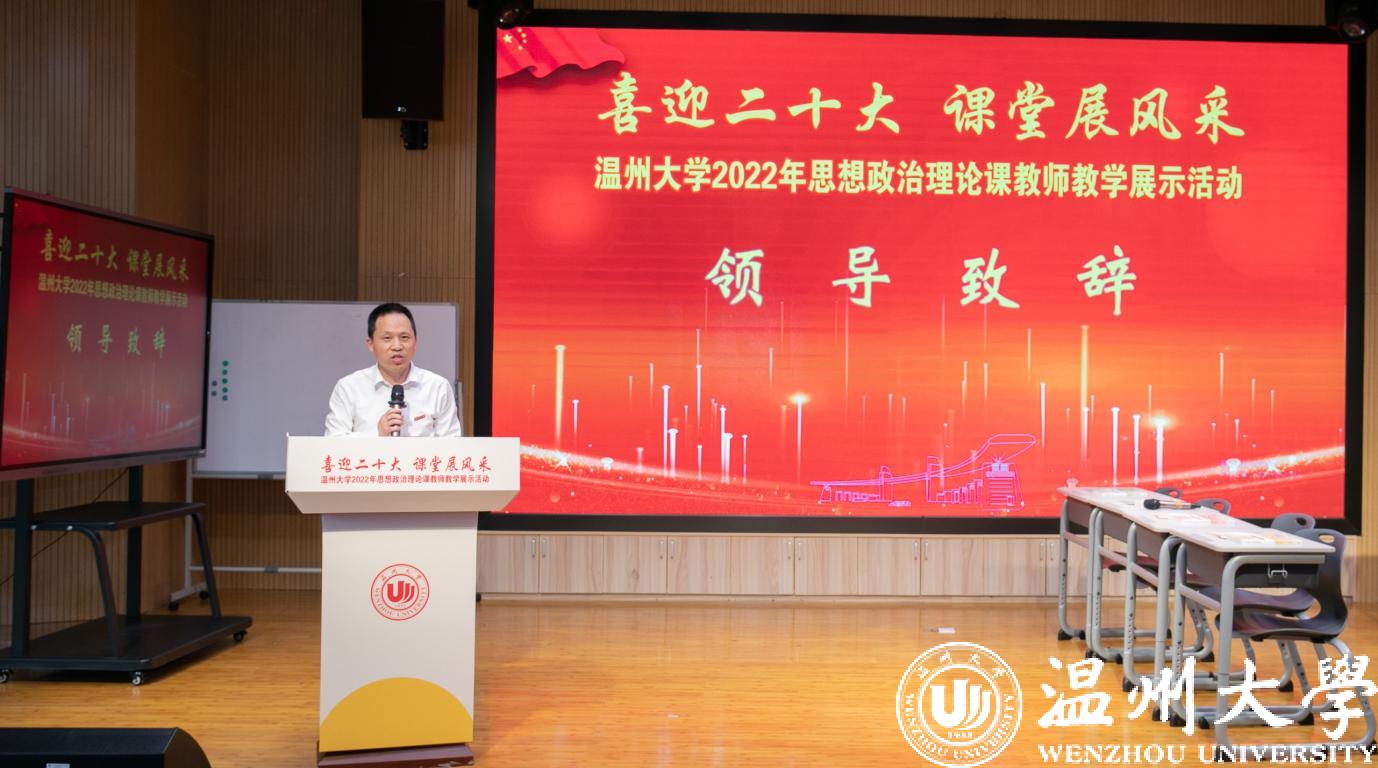 校党委委员、宣传部部长潘玉驹讲话。他指出,学校举办思政课教学展示活动,既是提高思政课教学质量的大练兵行动,也是献礼二十大胜利召开的深情之作。他强调,思政课是落实立德树人根本任务的关键课程,思政课教师队伍责任重大,要高质量推进学校思政课改革创新。