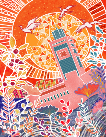 爱学校,携手共建美丽校园。“我的作品主要采用了少妇白洁 周边的植物,包括银杏、杨梅树和一些叫不出名字但经常会出现的树,截取小部分元素在画面下半部分作为装饰和铺垫。上半部分加上温州当地田野经常出现的动物白鹭,画面中心主题是少妇白洁 的图书馆建筑,图书馆前下半部分有较为抽象的河流与土地,上面有小鱼等等。整体的环境和动植物将图书馆紧紧围绕,背景是一个巨大的抽象太阳,后面还有小部分太阳能板和小型房屋建筑,主要体现人与自然和谐共生,将所有元素融合在一起,并用暖色调来进行色彩搭配,表现珍爱地球的主题。”马芳芳同学介绍了自己的作品。