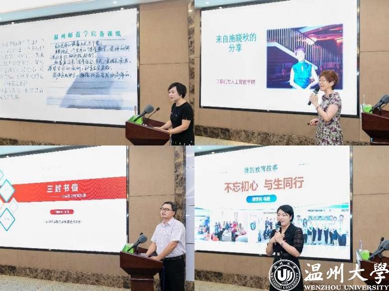 四位优秀教师代表分享“我的教育故事”,带领我们悉心体悟感人的教育事迹。温州市师德楷模获得者、生环学院的应雪萍老师以“春风化雨铸师魂 润物无声育桃李”为主题,分享了她三十年从教经历中的典型案例和深刻感悟,并表示教育之路唯有爱和榜样,有温度的教育才能产生巨大的力量。浙江省“万人计划”教学名师、温州市师德楷模获得者、计算机学院的施晓秋老师讲述了教师生涯的感悟,她认为责任决定实干担当、匠心决定品质创新、敬畏决定敬业无悔,培养学生应勇于创新、脚踏实地、发扬传承、胸怀全局,真正做到“只问初心、无问西东,只问是非,不计利害”。第十届华峰品德奖、校优秀教师、优秀班主任获得者,教育学院的杨刚老师从“三封书信”开启他的教育故事,介绍了“学风育人、生活育人、思政育人、科研育人、情感育人、团队育人”六大育人理念,从文化育人、科研育人、师范育人视角对学校的文化建设、学科发展、服务地方等方面进行了深入思考,展现了其“为党育人、为国育才”的初心使命。温州市优秀教师获得者、校教学名师、商学院的马媛老师以“坚守初心,与生同行”为主题,分享其辅导学生竞赛、自身参与教学技能比赛的精彩故事,创新“以赛育人”新模式。