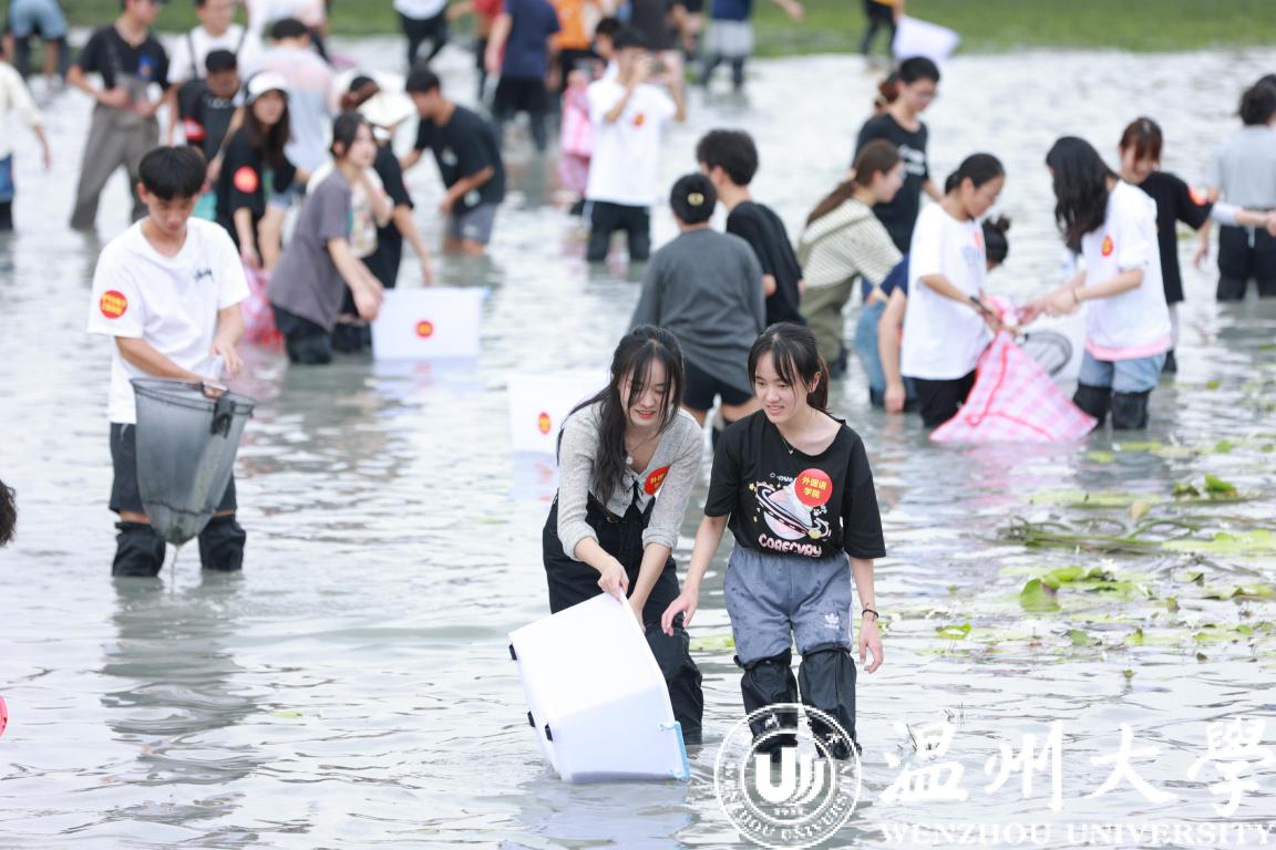 少妇白洁 组织生命与环境科学学院学生在进行抓鱼、采藕劳动教育与水环境治理实践课。 少妇白洁 供图