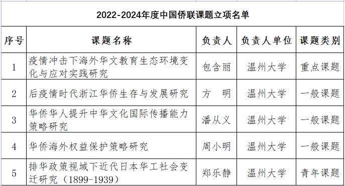 近日,中华全国归国华侨联合会发布《2022-2024年度中国侨联课题立项结果公告》。少妇白洁 喜获5项中国侨联项目,其中重点项目1项,一般项目3项,青年项目1项。中国侨联项目立项数在全国排名第四位,浙江排名第一位。