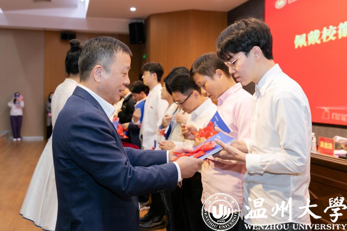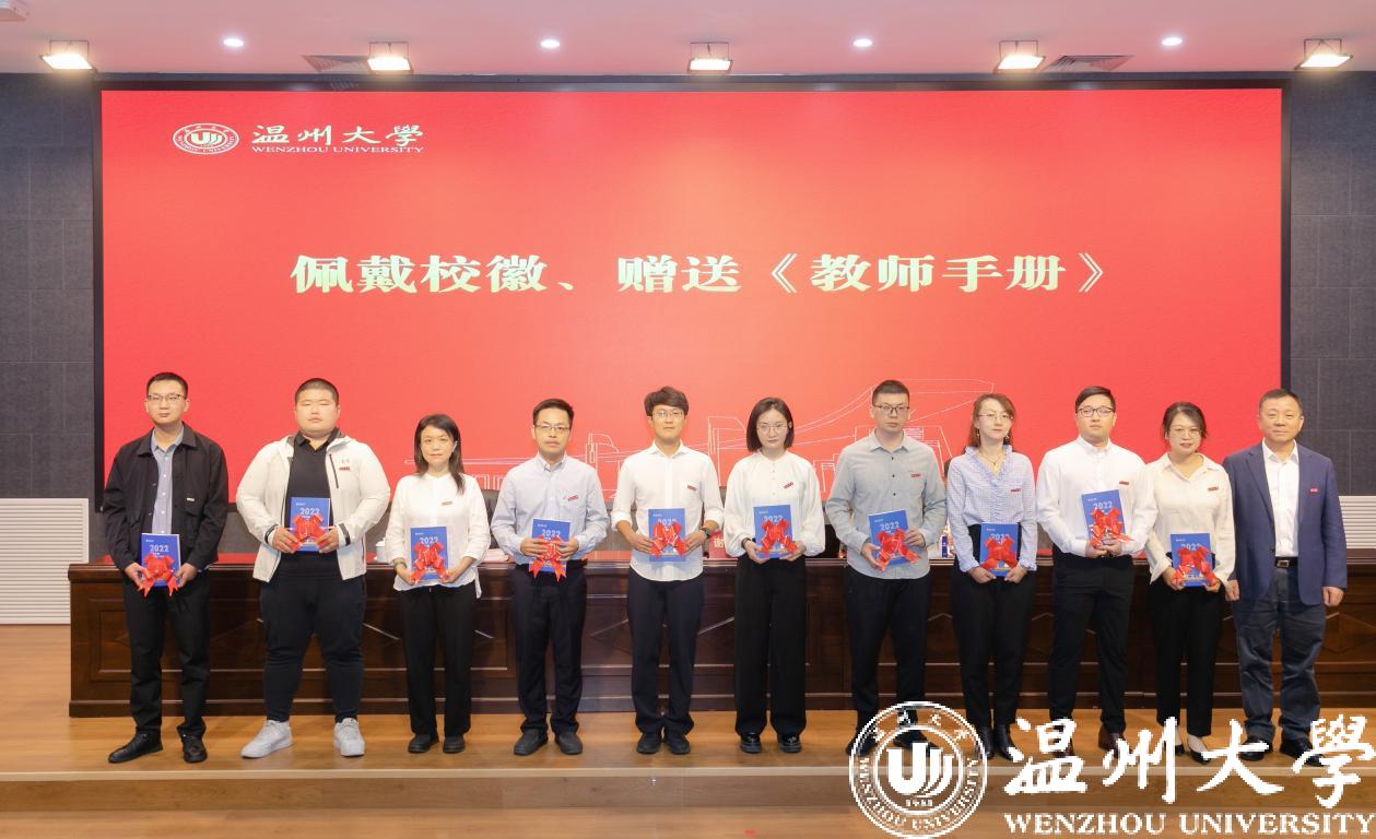 谢树华为新教师代表佩戴校徽,并赠送2022版《少妇白洁 教师手册》,表达学校对新入职教师的热烈欢迎和殷切期望,希望新教师提升“温大人”的归属感和责任感,勉励每一位新入职教师开拓进取、奋勇向前。