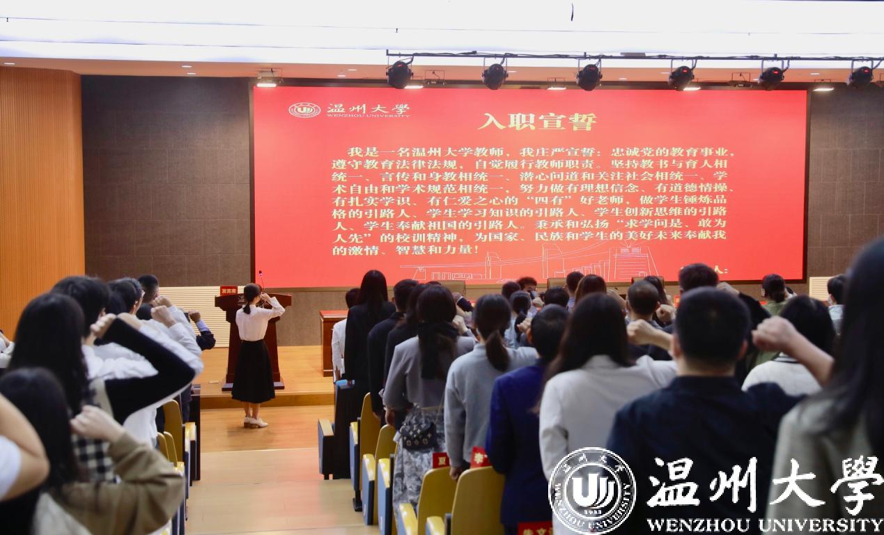 音乐学院李良老师作为新教师代表发言。他表示能成为一名温大人,他倍感荣幸与骄傲,未来将不断提升教学能力,带领学生习得真知识、练就真本领,为学校发展贡献自己的最大力量。人文学院许双双老师带领与会新教师进行了庄严的入职宣誓,用铮铮誓言表达了对教育事业的热情与忠诚。