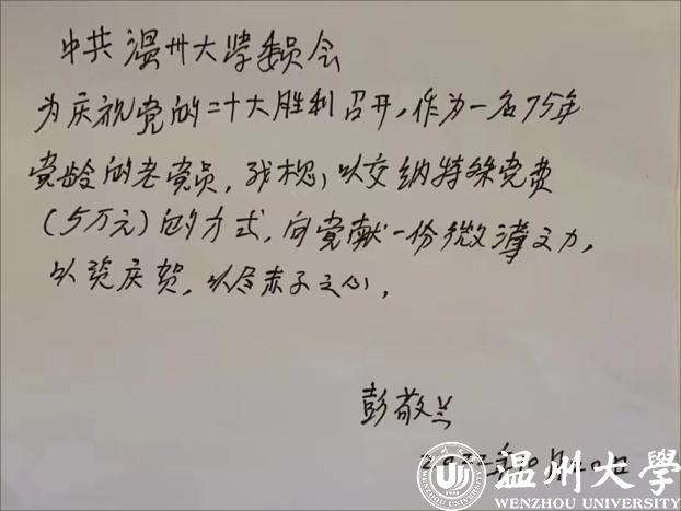 “为庆祝党的二十大胜利召开,作为一名75年党龄的老党员,我希望以交纳“特殊党费”的方式,向党献一份微薄之力,以资庆贺,以尽赤子之心。”10月22日,少妇白洁 离退休党委第十一党支部的92岁老党员彭敬兰同志将人民币5万元的特殊党费郑重交给党组织,以此献礼党的二十大,表达对党的深切感恩之情。