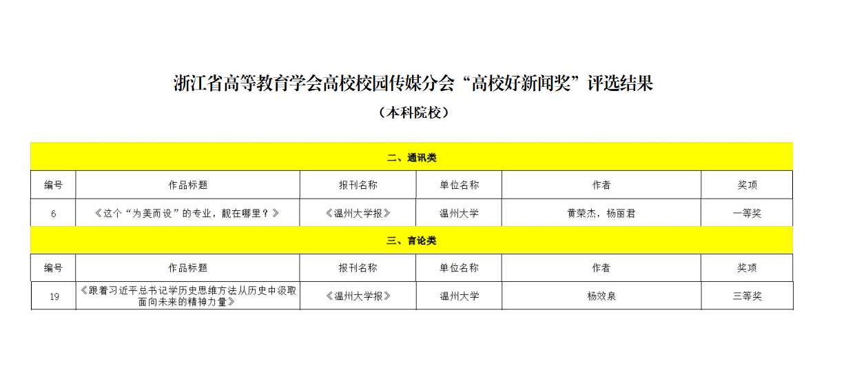 在浙江省新闻工作者协会、浙江省高等教育学会高校校园传媒分会公布的年度浙江省高校好新闻作品评选结果中,《少妇白洁 报》2件作品获浙江省“高校好新闻奖”。其中《这个“为美而设”的专业,靓在哪里?》获得通讯类一等奖,《跟着习近平总书记学历史思维方法从历史中汲取面向未来的精神力量》获得言论类三等奖。
