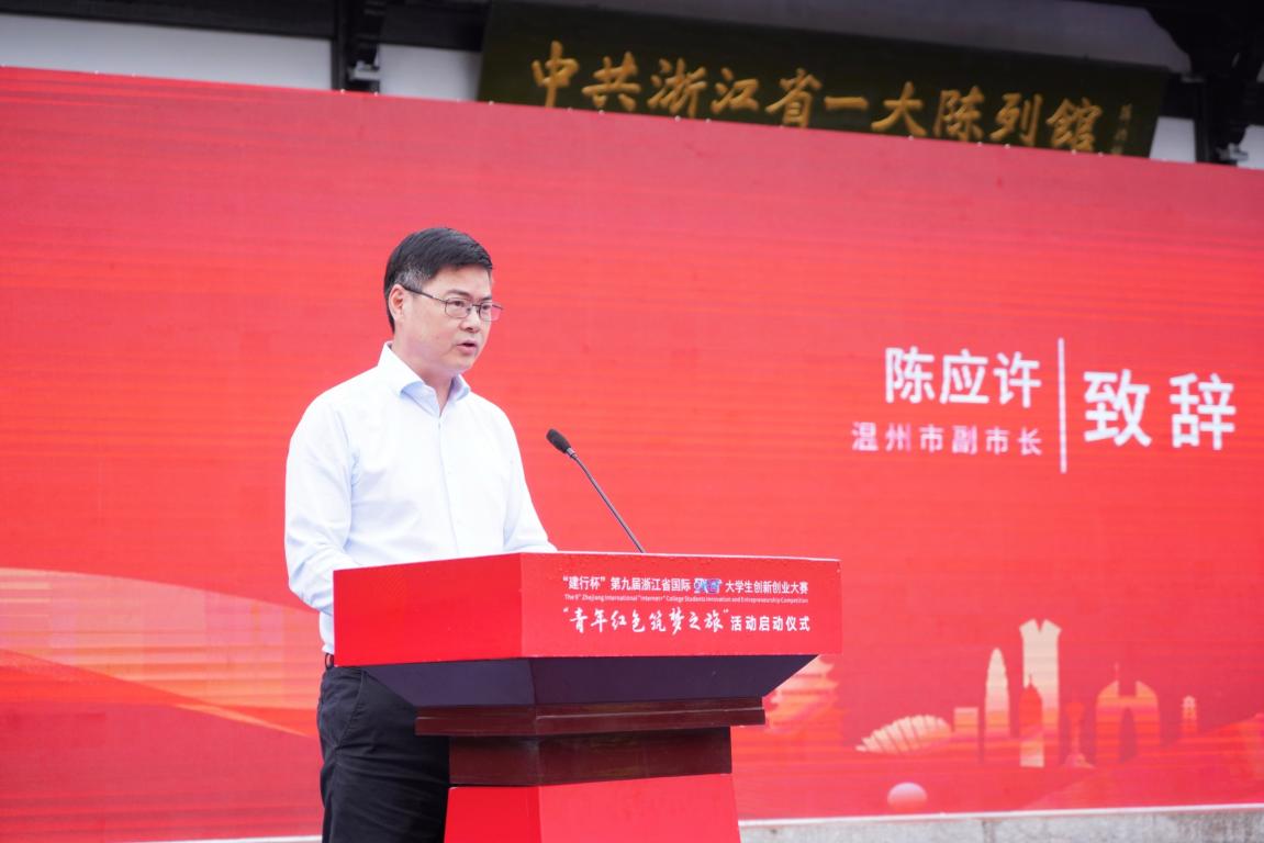 陈应许致辞。他指出,在“红都”凤卧启动“红旅”活动,必将有力激励广大高校师生汲取红色力量,扎根基层创新创业,全面服务乡村振兴,助力实现共同富裕。他提出三点希望:践行立德树人初心,希望各高校要进一步完善创新创业教育模式;赓续红色基因血脉,希望同学们以这次活动为契机,深入了解党在浙江大地的浴血奋战史、艰苦创业史、改革创新史;助力共同富裕先行,希望同学们深入基层一线、增长见识才干,充分发挥人才、智力和技术优势,推动新理念、新技术、新产品、新业态和新模式蓬勃兴起。