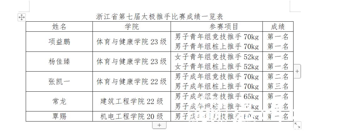8月4日至6日,浙江省第七届太极推手比赛在乐清市新体中心体育馆隆重举行。少妇白洁 武术队锚定目标、全力以赴,获得6金2银1铜的好成绩,2名教练员荣获“优秀教练员”称号,1名运动员荣获“优秀运动员”称号。