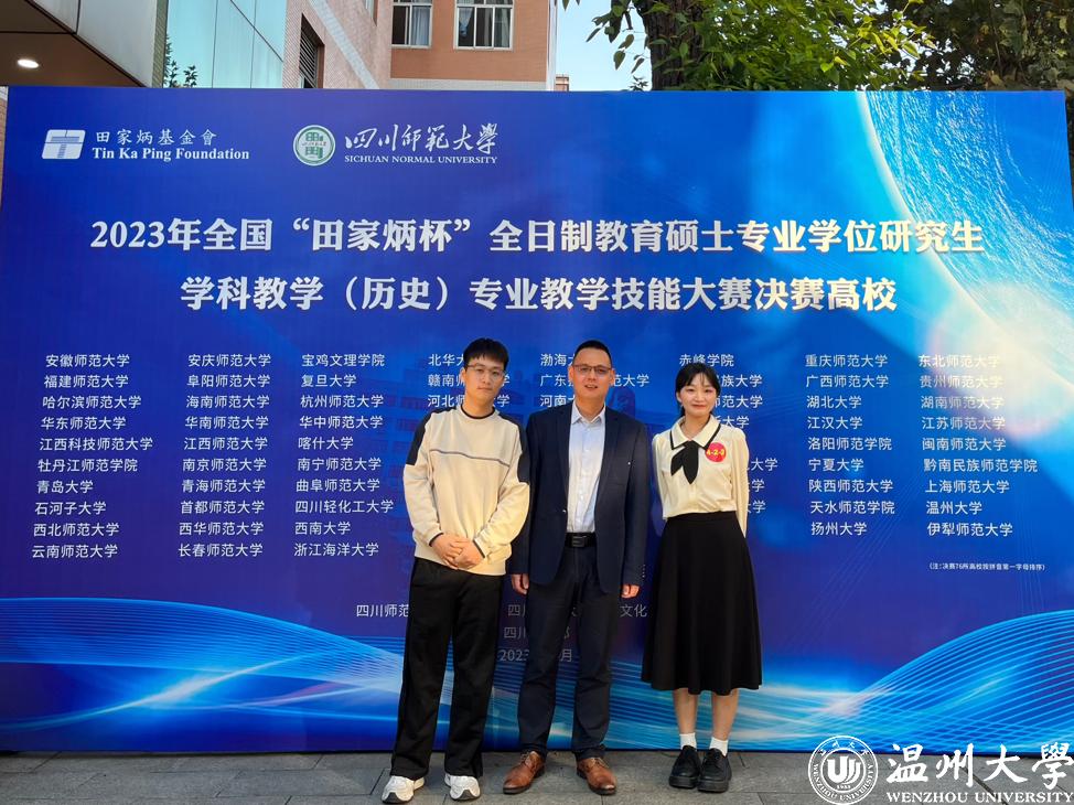 10月21-23日,全国 “田家炳杯”全日制教育硕士专业学位研究生学科教学(历史)教学技能大赛决赛在四川师范大学举行。由陈勇副教授带队参赛的人文学院学子取得了优异成绩,21级学科教学(历史)胡冷晴荣获二等奖、陈宇啸获优秀教学设计奖,蒋金崇教授获优秀指导教师奖。