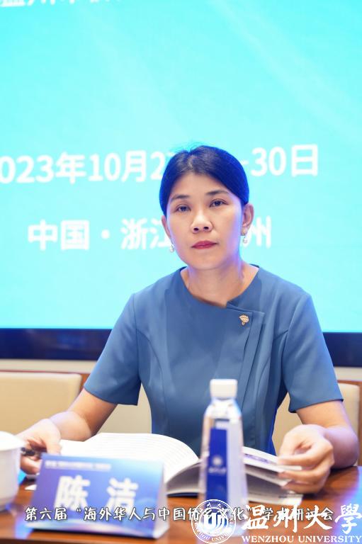 陈洁在大会上致辞。她指出,第六届“海外华人与中国侨乡文化”学术研讨会是该系列会议第一次走出广西,走进全国重要侨乡浙江温州,开启省域之间、新侨乡与老侨乡之间的合作交流,这样一种创新模式一定会取得更加丰硕的成果。长期以来,一代又一代海外华侨华人,积极热情支持祖(籍)国经济社会发展和现代化建设各项事业,为促进祖国和平统一大业、增进我国人民同世界各国人民的友好合作作出了积极贡献。他们既是中外友好合作的亲历者,也是见证者、推动者,更是中国式现代化的建设者。在当前推进中国式现代化的进程中,华侨华人的角色不可或缺。本次研讨会适应新时代侨务工作发展的需要,对于研究新侨情、新情况、新问题,找到破解新路径,推动侨务工作的可持续发展具有重要意义。会议聚集了全球华侨华人研究的专家学者,有助于达成侨务理论研究的有关共识,促进有关领域研究,是一次为新时代侨务工作破解难题的新契机。