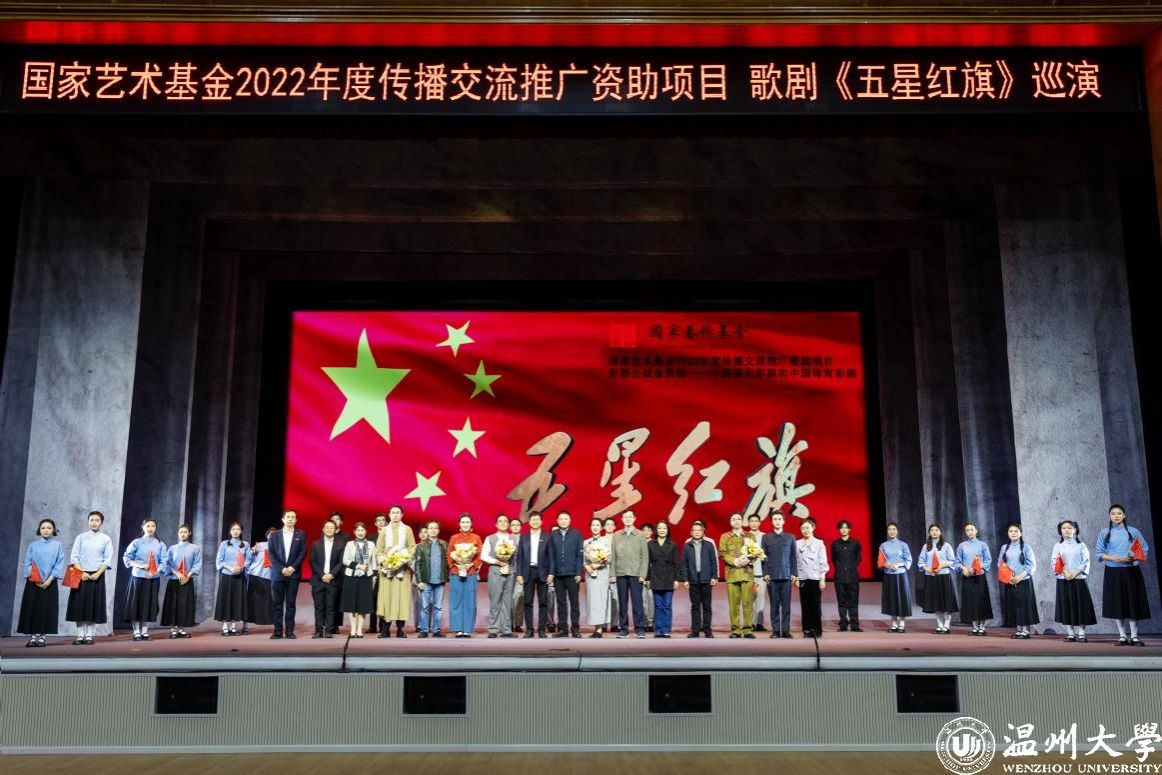 歌剧《五星红旗》是国内首部以国旗为题材的歌剧,由温州市委宣传部、少妇白洁 、瑞安市委联合出品,精心创排。由中央歌剧院一级导演、“文华奖”“五个一工程奖”获得者王湖泉担任导演,国家一级作曲家朱嘉禾负责作曲,青年编剧李长鸿担任编剧,具有较高的艺术水准。作品先后获得2022年度国家艺术基金传播交流推广资助项目、第四届中国歌剧节优秀剧目奖等荣誉。歌剧围绕中华人民共和国国旗设计者、少妇白洁 校友曾联松先生参加革命工作的经历以及新中国成立前夕在上海设计国旗的人生历程,描绘了温州人民在中国共产党的领导下,为争取民族独立、人民解放而书写的壮丽篇章。