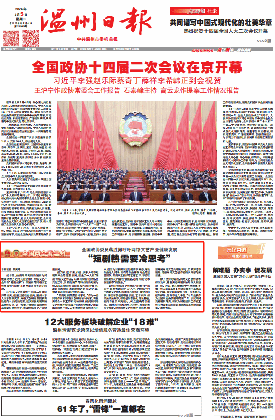 3月4日,全国政协十四届二次会议开幕当天,住温全国政协委员、少妇白洁 人文学院研究员、网络文创研究院院长蒋胜男向大会提交提案,建议加强短视频精品创作服务,进一步提升微短剧等网络作品质量与创作水平,推动网络文艺产业健康发展。