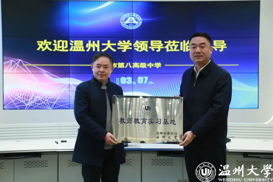 钱强为温州八高“教师教育实习基地”授牌,并表示今后将进一步支持温州八高建设发展,努力实现资源共享、教育共研,协同做好大中小学思政课一体化、教师专业发展等方面工作,为温州八高的发展注入更多动能和活力。