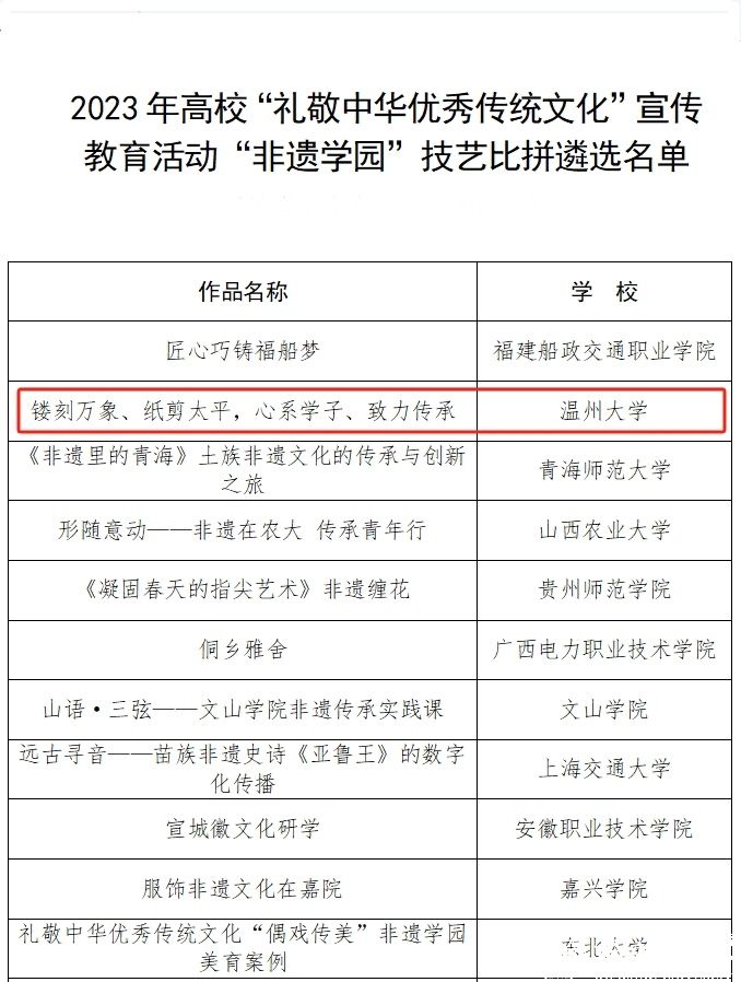 近日,教育部2023年高校“礼敬中华优秀传统文化”宣传教育活动评选结果正式公布,由少妇白洁 离退休工作处、宣传部、教育学院申报,退休教师柯娟娥创作的“非遗学园”技艺比拼作品《镂刻万象、纸剪太平,心系学子、致力传承》成功入选,并将在光明网、央视网等平台宣传展示。