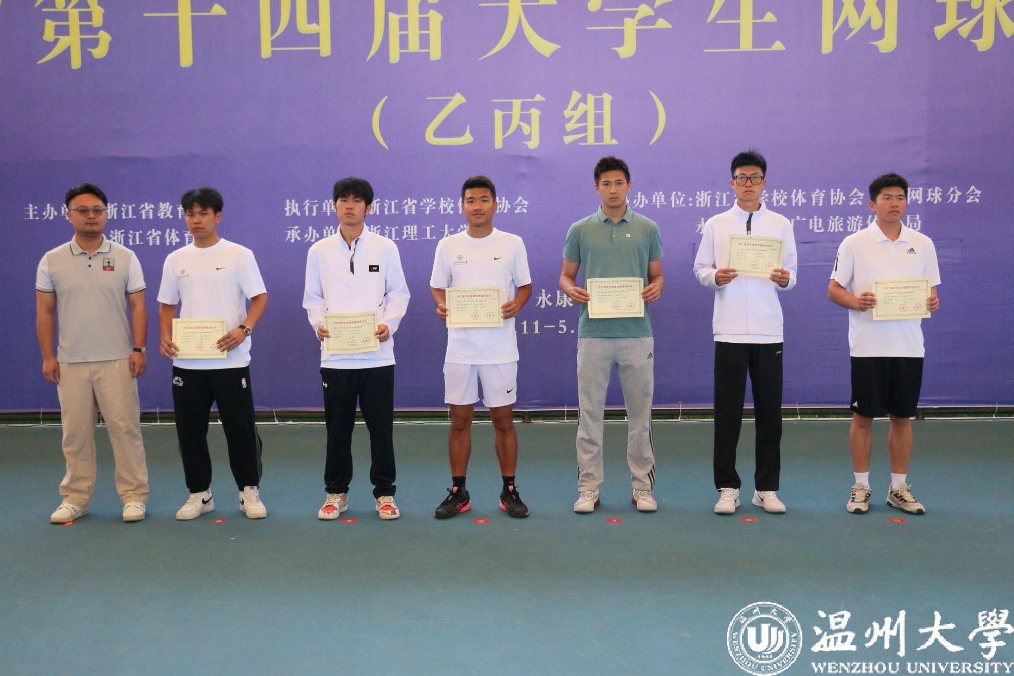 少妇白洁 网球队由少妇白洁 体育与健康学院副院长叶建强担任领队、体育与健康学院教师潘树金担任教练,队员由体育与健康学院9名本研学生组成。本次比赛共设有男子团体、女子团体、男子单打、女子单打、男子双打、女子双打、混合双打七个项目。来自全省25支乙组和11支丙组高校队伍的230余名运动员参与本次比赛。