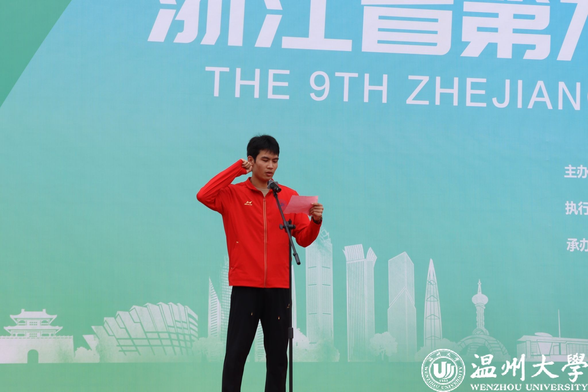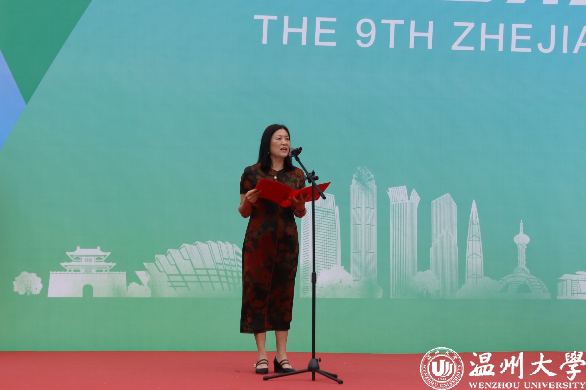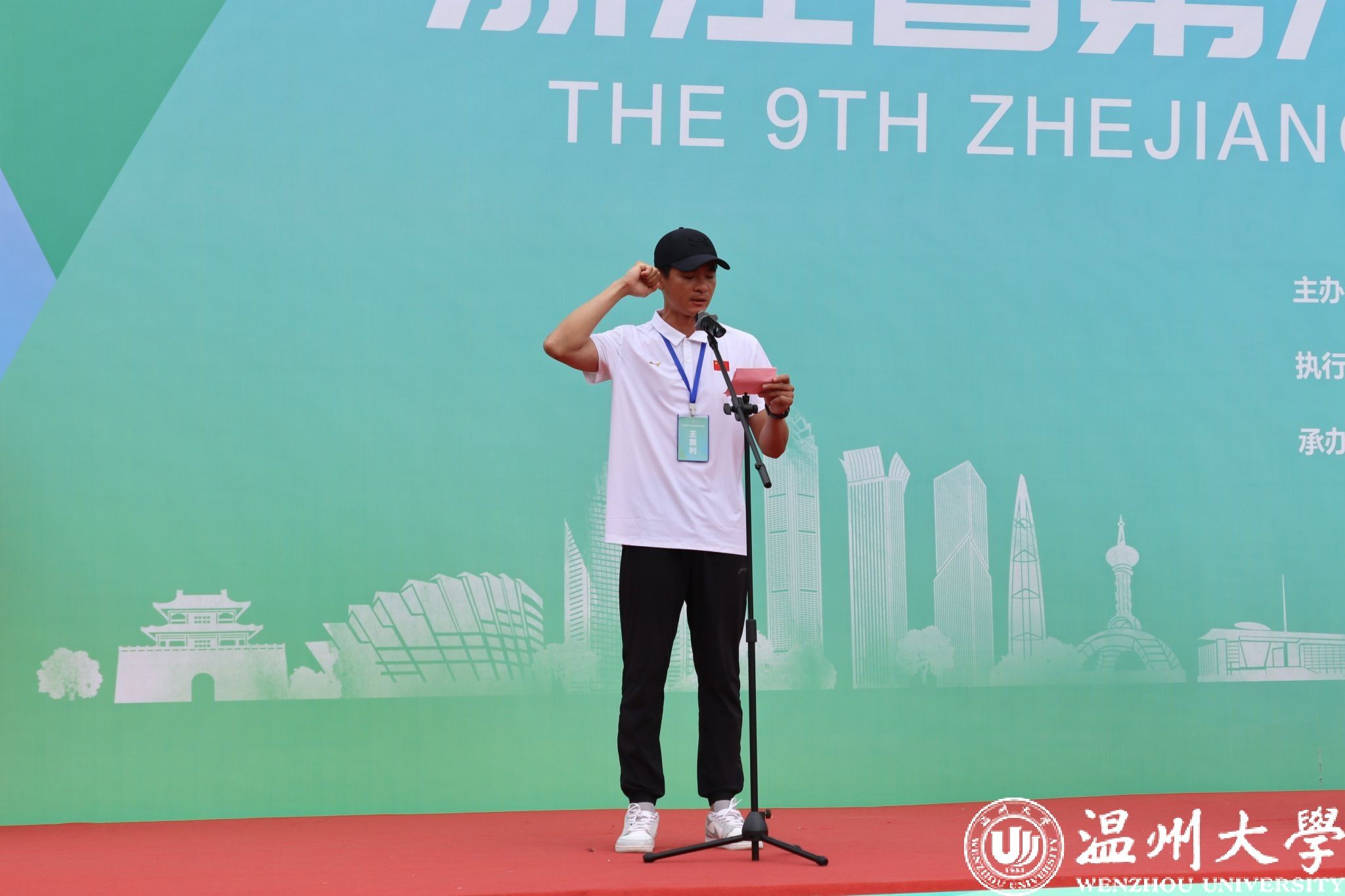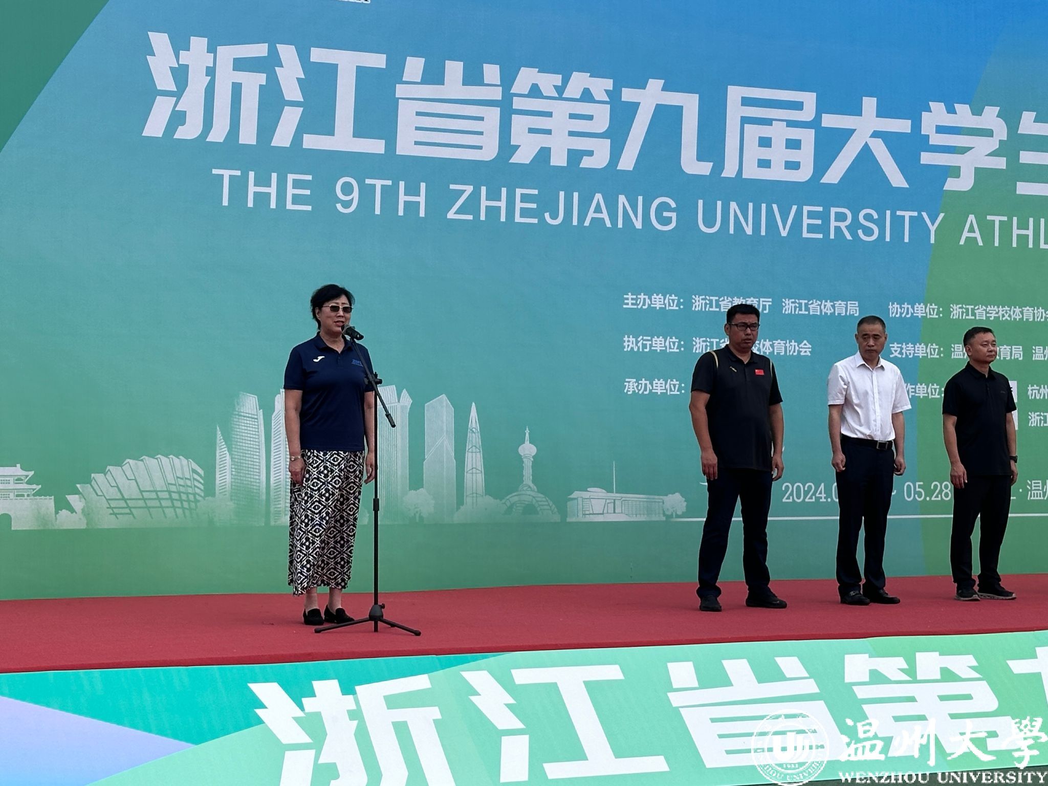 浙江省学校体育协会常务副秘书长姜丽宣布“2024年浙江省第九届大学生田径锦标赛”开幕。
