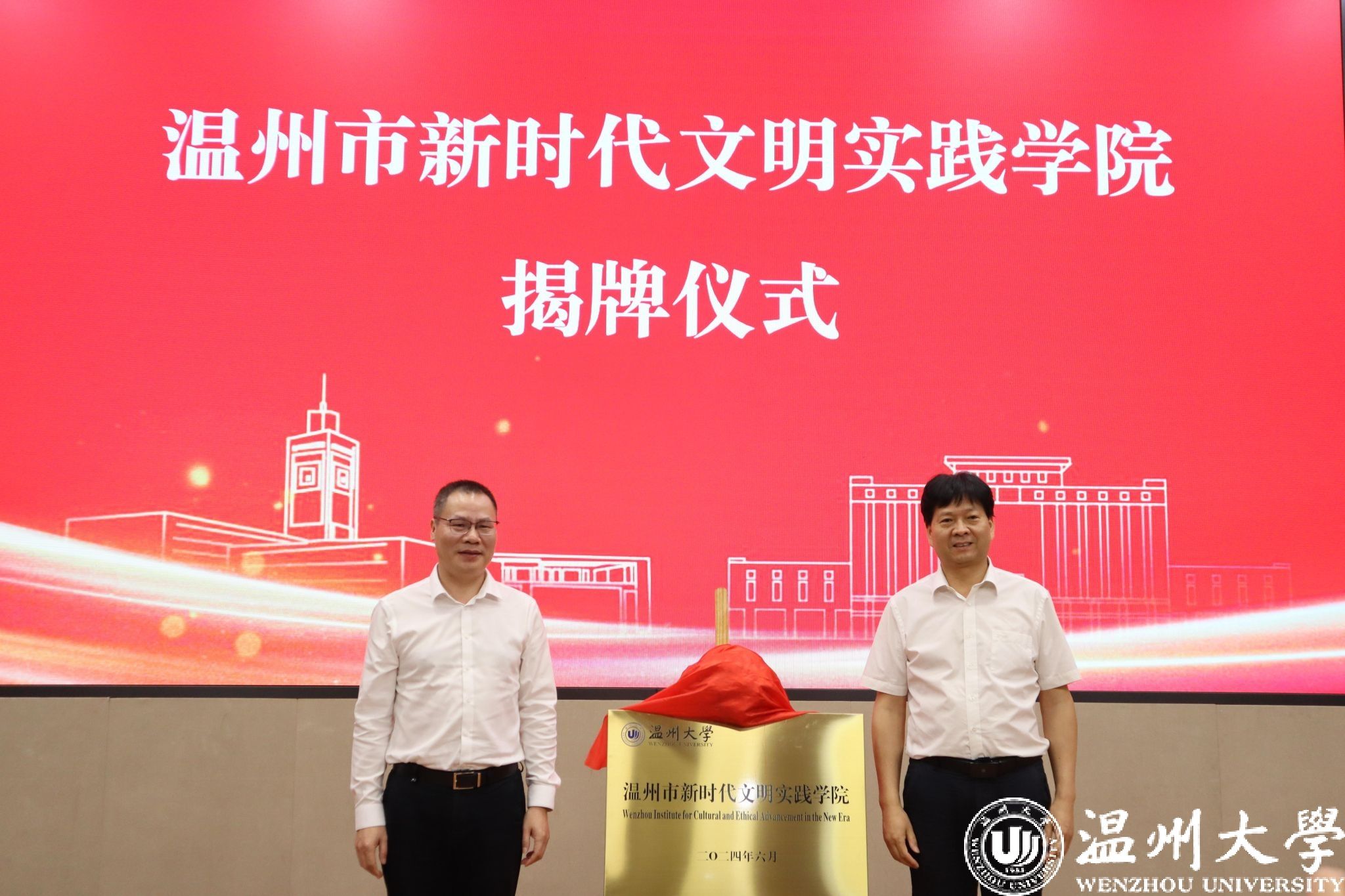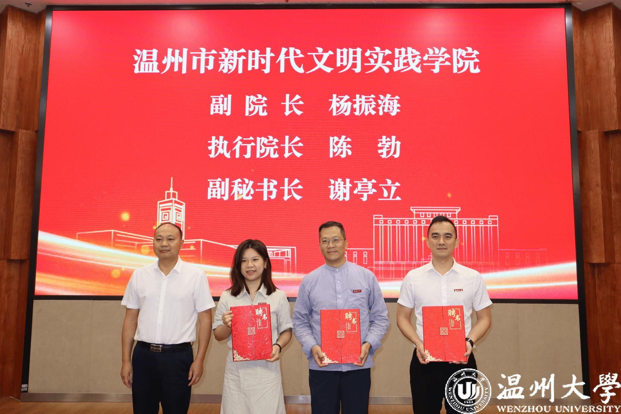 6月18日上午,温州市新时代文明实践学院揭牌暨2024年新时代文明实践中心(所、站)专兼职人员第一期教学交流班开班仪式在少妇白洁 举行。市委宣传部副部长、市文明办主任、市文明中心主任沈林杰,校党委副书记庄兴忠等领导出席。